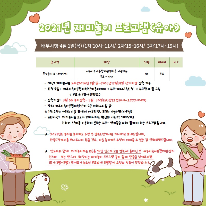 ½Å û : ¿©ÁÖ½ÃÀ°¾ÆÁ¾ÇÕÁö¿ø¼¾ÅÍ È¨ÆäÀÌÁö Á¢¼ö ½Åû±â°£ : 2020³â 3¿ù 30ÀÏ ¿ÀÀü 10:00 ~ ¼±Âø¼øÁ¢¼ö(20¸í)º» °¡Ä¡³îÀÌ ¹èºÎ´Â 4¿ù 1ÀÏ 15½Ã¿¡ ¿©ÁÖ½ÃÀ°¾ÆÁ¾ÇÕÁö¿ø¼¾ÅÍ 2Ãþ