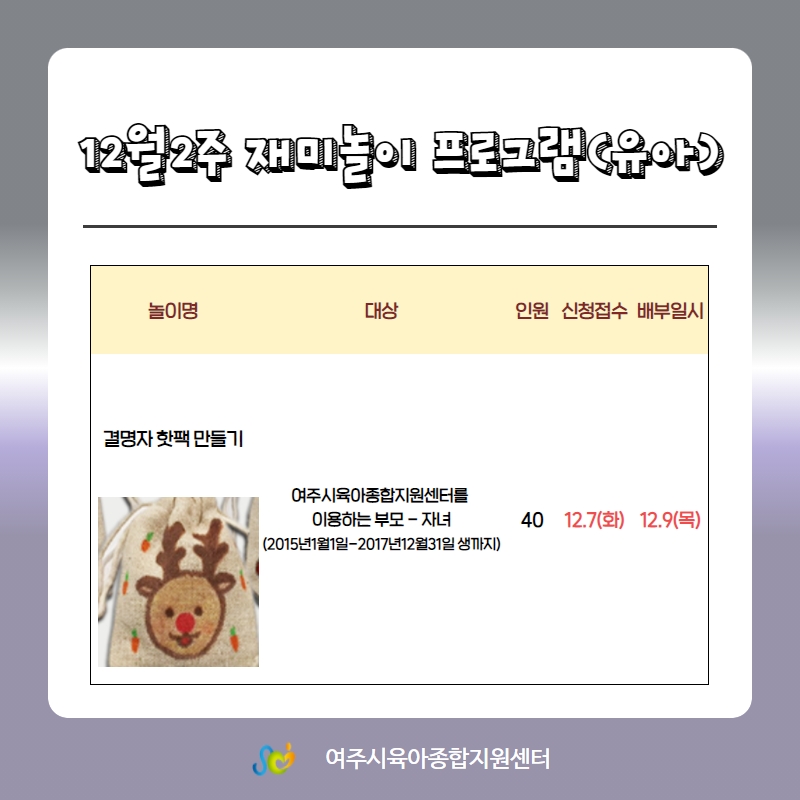 ½Åû±â°£ : 2021³â 12¿ù 7ÀÏ ¿ÀÀü 10:00 ~ ¼±Âø¼øÁ¢¼ö(20¸í) ´ë »ó : 2015³â 1¿ù1ÀÏ ~ 2017³â 12¿ù 31ÀÏ»ý±îÁö ½ÅûÁ¢¼ö °¡´ÉÇÕ´Ï´Ù.º» Àç¹Ì³îÀÌ ¹èºÎ´Â 12¿ù 9ÀÏ¿¡ ¿©ÁÖ½ÃÀ°¾ÆÁ¾ÇÕÁö¿ø¼¾ÅÍ 2Ãþ ¾ÆÇØ´©¸®½Ç ¾Õ¿¡¼ ¹èºÎÇØ µå¸³´Ï´Ù.