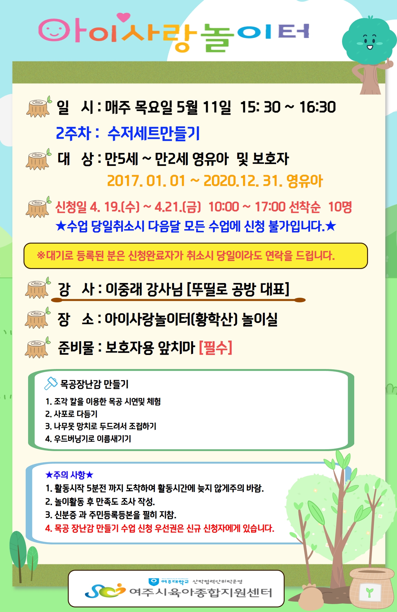 | ±âŸ»çÇ× | Áغñ¹° : º¸È£ÀÚ¿ë ¾ÕÄ¡¸¶ Áغñ, 3°³¿ù ÀÌÀü µîº» Çʼö *Ãë¼Ò½Ã ¹Ýµå½Ã ÀüÈ ¿¬¶ôÀ» ÁּžßÇÕ´Ï´Ù. *³îÀÌȰµ¿ ½Åû ÈÄ ¼ö¾÷¿¡ ºÒÂü½Ã ´ÙÀ½ ¸ðµç ¼ö¾÷¿¡ ½ÅûºÒ°¡ *½ÅûµÇ½Å ȸ¿øÀº È®Á¤ ¾È³» Àüȸ¦ µå¸³´Ï´Ù. ´ë±â·Î µî·ÏµÈ ºÐÀº ½Åû¿Ï·áÀÚ°¡ Ãë¼Ò½Ã ´çÀÏÀÌ¶óµµ ¿¬¶ôÀ» µå¸³´Ï´Ù. *1°¡Á¤´ç ¾Æµ¿ 1¸í¸¸ ½Åû°¡´É(½ÖµÕÀÌ´Â ¿¹¿Ü º¸È£ÀÚ´Â °¢°¢ ¿À¼Å¾ß ÇÕ´Ï´Ù) |