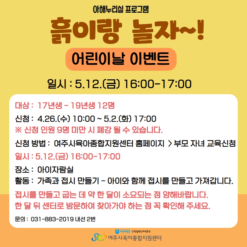 | ¾ÆÇØ´©¸®½Ç ÈëÀ̶û ³îÀÚ ¾î¸°À̳¯ À̺¥Æ® 5.12.(±Ý) °¡Á·°ú ÇÔ²² Á¢½Ã ¸¸µé±â | |||