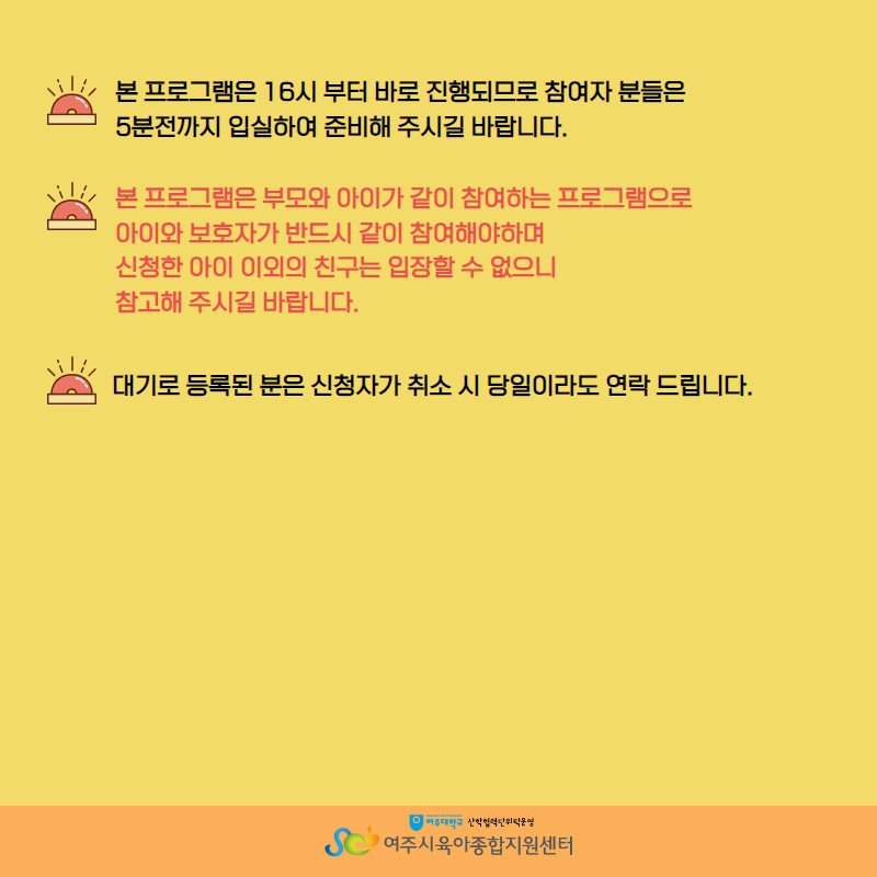 | ±âŸ»çÇ× | º» ÇÁ·Î±×·¥Àº ½ÅûÇÑ ¾ÆÀÌ¿Í º¸È£ÀÚ 1Àθ¸ Âü¼® °¡´ÉÇÕ´Ï´Ù. ½ÅûÀÚ ¿Ü¿£ Âü¿© ºÒ°¡ÇÕ´Ï´Ù. ½Åû È®Á¤ ¹®ÀÚ¸¦ ¼ö·ÉÇϽŠÈÄ Ãë¼Ò³ª °á¼®Àº ´ÙÀ½´Þ ÇÁ·Î±×·¥ À̿뿡 Á¦ÇÑµÉ ¼ö ÀÖÀ¸´Ï Âü°íÇØ ÁÖ½Ã±æ ¹Ù¶ø´Ï´Ù. ´ë±â·Î µî·ÏµÈ ºÐÀº ½Åû ¿Ï·áÀÚ°¡ Ãë¼Ò½Ã ´çÀÏÀÌ¶óµµ ¿¬¶ôÀ» µå¸³´Ï´Ù. |