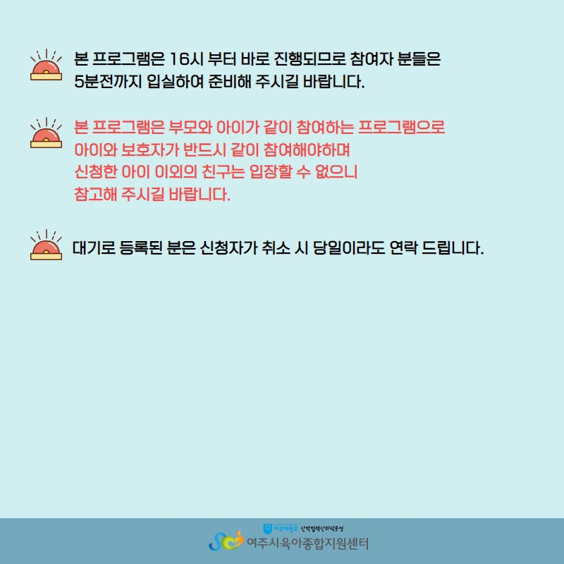 | ±âŸ»çÇ× | º» ÇÁ·Î±×·¥Àº ½ÅûÇÑ ¾ÆÀÌ¿Í º¸È£ÀÚ 1Àθ¸ Âü¼® °¡´ÉÇÕ´Ï´Ù. ½ÅûÀÚ ¿Ü¿£ Âü¿© ºÒ°¡ÇÕ´Ï´Ù. ½Åû È®Á¤ ¹®ÀÚ¸¦ ¼ö·ÉÇϽŠÈÄ Ãë¼Ò³ª °á¼®Àº ´ÙÀ½´Þ ÇÁ·Î±×·¥ À̿뿡 Á¦ÇÑµÉ ¼ö ÀÖÀ¸´Ï Âü°íÇØ ÁÖ½Ã±æ ¹Ù¶ø´Ï´Ù. ´ë±â·Î µî·ÏµÈ ºÐÀº ½Åû ¿Ï·áÀÚ°¡ Ãë¼Ò½Ã ´çÀÏÀÌ¶óµµ ¿¬¶ôÀ» µå¸³´Ï´Ù. |