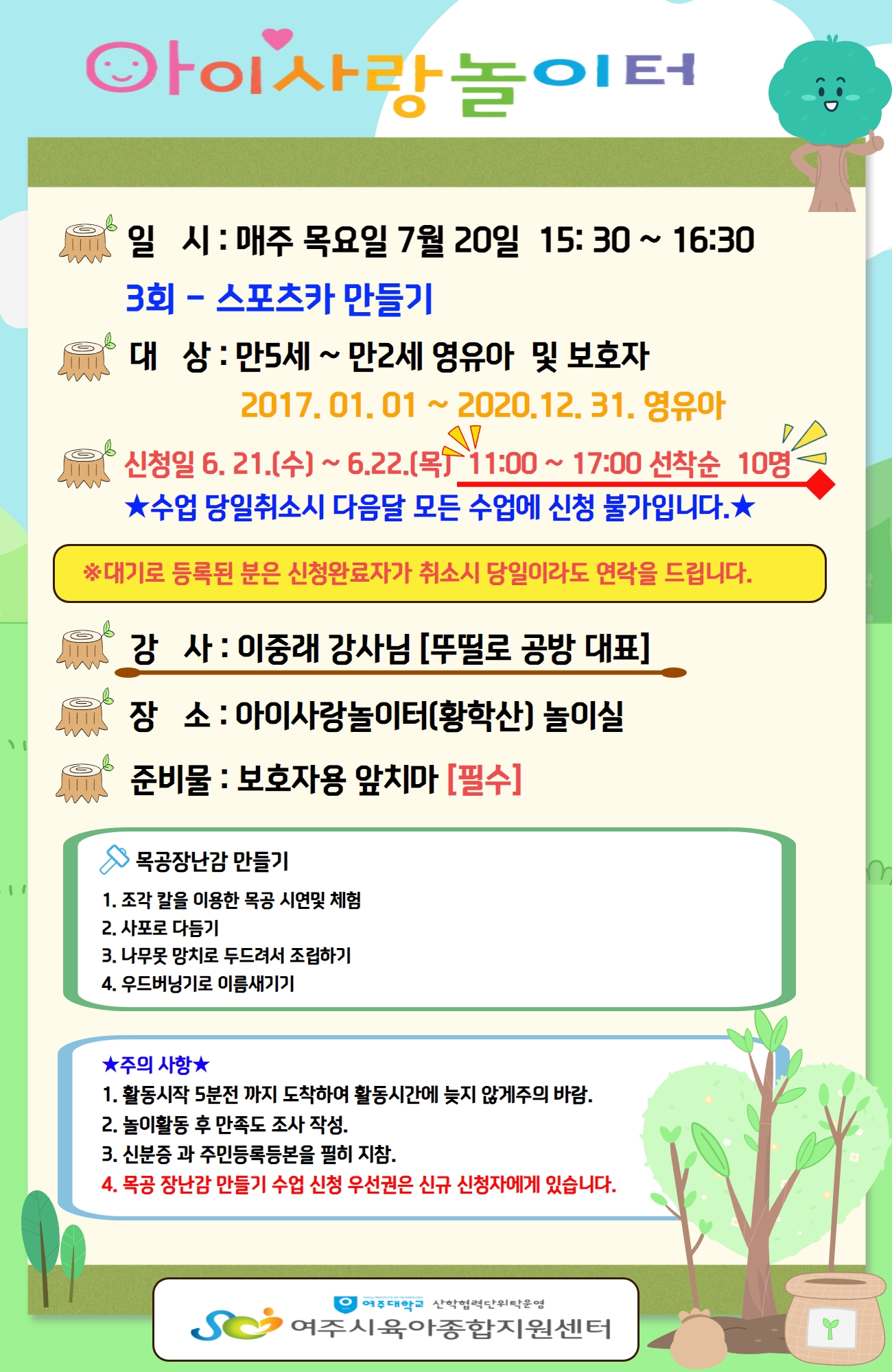 | ±âŸ»çÇ× | Áغñ¹° : º¸È£ÀÚ¿ë ¾ÕÄ¡¸¶ Áغñ, 3°³¿ù ÀÌÀü µîº» Çʼö *Ãë¼Ò½Ã ¹Ýµå½Ã ÀüÈ ¿¬¶ôÀ» ÁּžßÇÕ´Ï´Ù. *³îÀÌȰµ¿ ½Åû ÈÄ ¼ö¾÷¿¡ ºÒÂü½Ã ´ÙÀ½ ¸ðµç ¼ö¾÷¿¡ ½ÅûºÒ°¡. *½ÅûµÇ½Å ȸ¿øÀº È®Á¤ ¾È³» ¹®ÀÚ¸¦ µå¸³´Ï´Ù. *1°¡Á¤´ç ¾Æµ¿ 1¸í¸¸ ½Åû°¡´É(½ÖµÕÀÌ´Â ¿¹¿Ü ¹Ýµå½Ã º¸È£ÀÚ´Â °¢°¢ ¿À¼Å¾ß ÇÕ´Ï´Ù) ´ë±â·Î µî·ÏµÈ ºÐÀº ½Åû¿Ï·áÀÚ°¡ Ãë¼Ò½Ã ´çÀÏÀÌ¶óµµ ¿¬¶ôÀ» µå¸³´Ï´Ù. - ´ë±â½ÅûÀÚ¿¡°Ô ¿¬¶ô ÈÄ ºÎÀçÁ߽à 30ºÐÀ̳» ¿¬¶ôÀÌ ¾øÀ¸¸é ´ÙÀ½ ´ë±âÀÚ¿¡°Ô ±âȸ´Â ³Ñ¾î°¨ (´ë±âÀÚ¿¡°Ô º°µµÀÇ ¹®ÀÚ ¾È³»´Â ÇÏÁö ¾Ê½À´Ï´Ù.) |