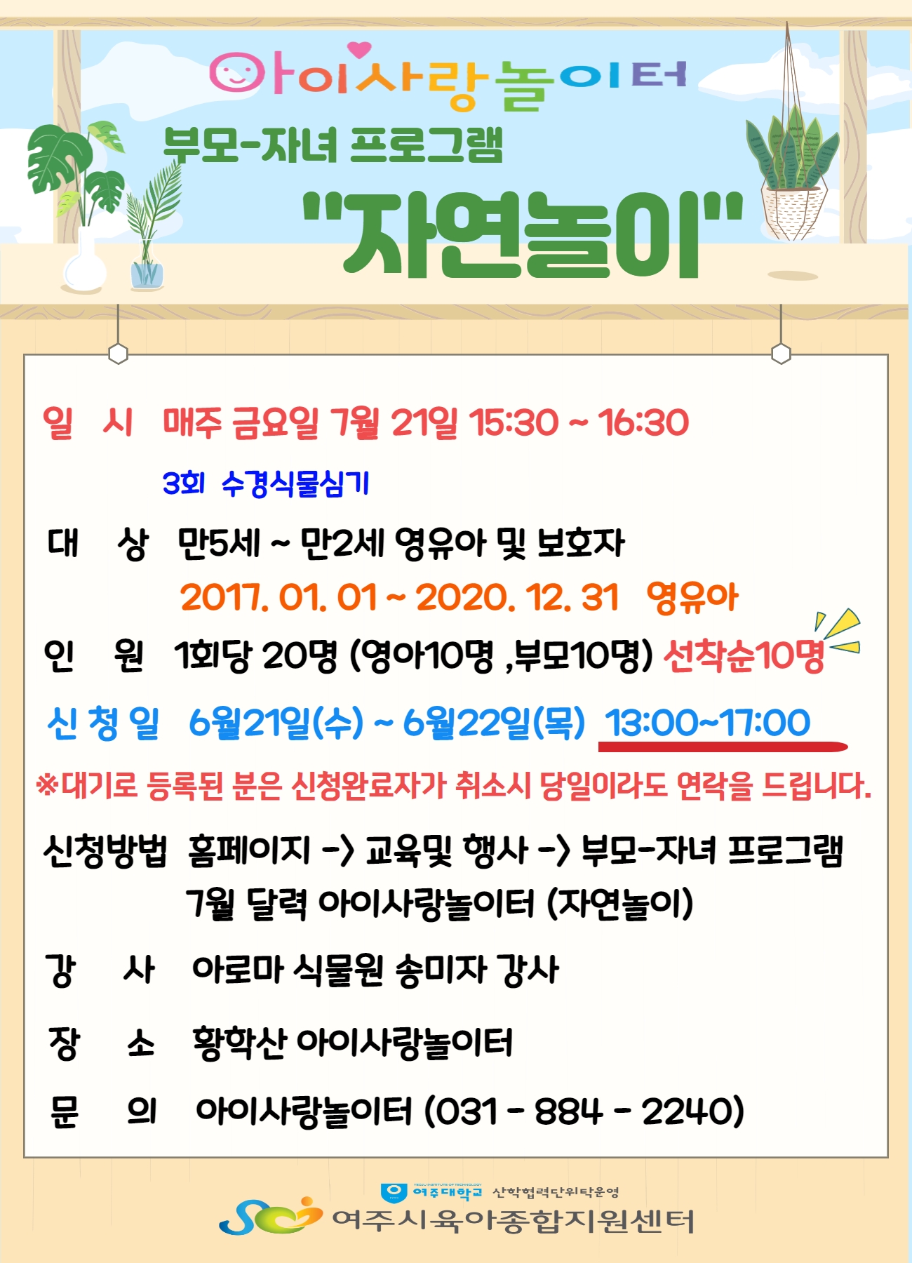| (17~20³â»ý) ¾ÆÀÌ»ç¶û³îÀÌÅÍ ÀÚ¿¬³îÀÌ ÇÁ·Î±×·¥ (¼ö°æ½Ä¹° ½É±â) | |||