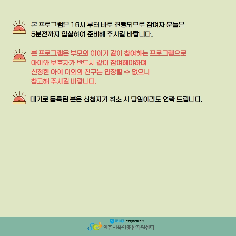 | ±âŸ»çÇ× | º» ÇÁ·Î±×·¥Àº ½ÅûÇÑ ¾ÆÀÌ¿Í º¸È£ÀÚ 1Àθ¸ Âü¼® °¡´ÉÇÕ´Ï´Ù.(º¸È£ÀÚ ÃÖ´ë 2ÀÎ) ½ÅûÀÚ ¿Ü¿£ Âü¿© ºÒ°¡ÇÕ´Ï´Ù. ½Åû È®Á¤ ¹®ÀÚ¸¦ ¼ö·ÉÇϽŠÈÄ Ãë¼Ò³ª °á¼®Àº ´ÙÀ½´Þ ÇÁ·Î±×·¥ À̿뿡 Á¦ÇÑµÉ ¼ö ÀÖÀ¸´Ï Âü°íÇØ ÁÖ½Ã±æ ¹Ù¶ø´Ï´Ù. ´ë±â·Î µî·ÏµÈ ºÐÀº ½Åû ¿Ï·áÀÚ°¡ Ãë¼Ò½Ã ´çÀÏÀÌ¶óµµ ¿¬¶ôÀ» µå¸³´Ï´Ù. |