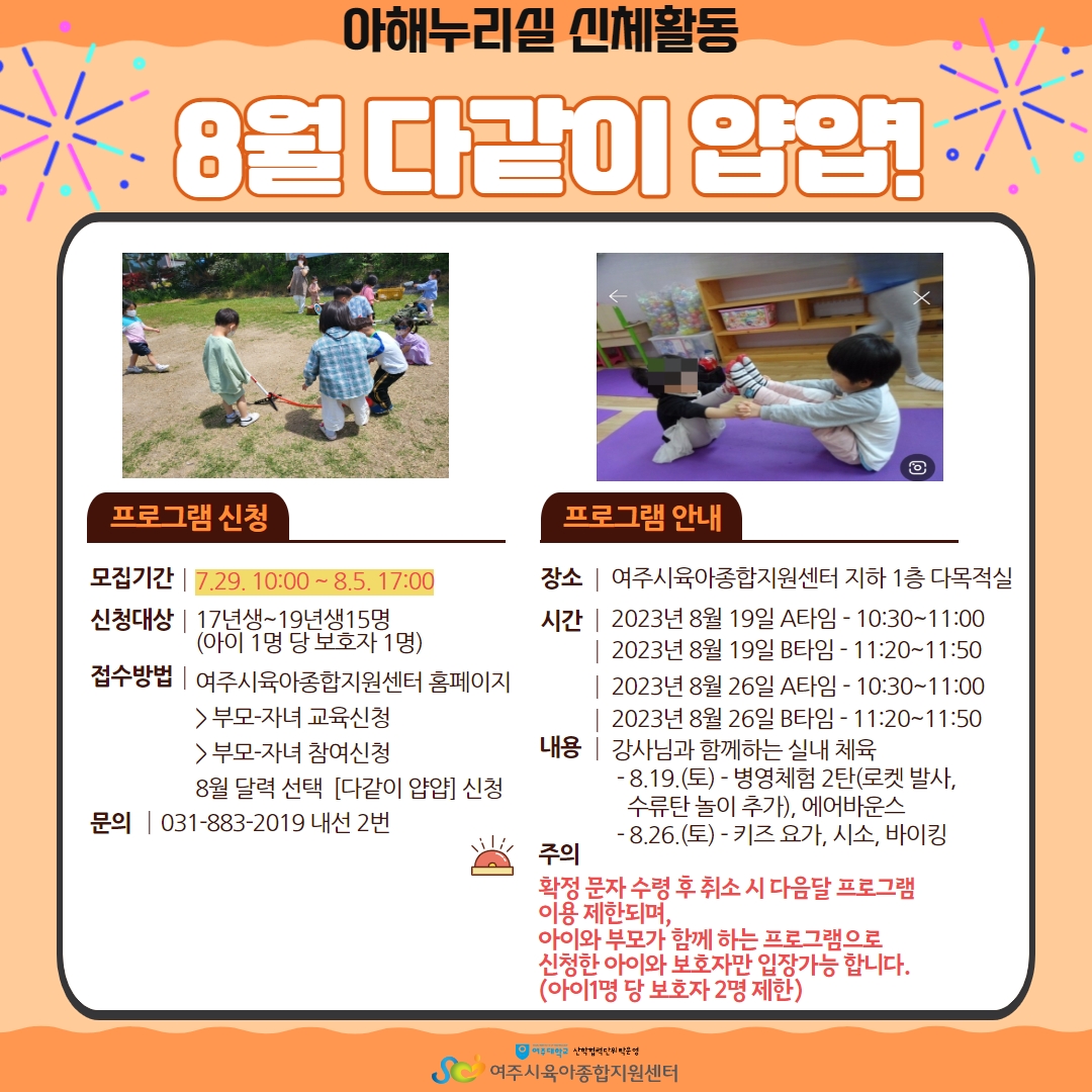 | ±âŸ»çÇ× | º» ÇÁ·Î±×·¥Àº ½ÅûÇÑ ¾ÆÀÌ¿Í º¸È£ÀÚ 1Àθ¸ Âü¼® °¡´ÉÇÕ´Ï´Ù.(º¸È£ÀÚ ÃÖ´ë 2ÀÎ) ½ÅûÀÚ ¿Ü¿£ Âü¿© ºÒ°¡ÇÕ´Ï´Ù. ½Åû È®Á¤ ¹®ÀÚ¸¦ ¼ö·ÉÇϽŠÈÄ Ãë¼Ò³ª °á¼®Àº ´ÙÀ½´Þ ÇÁ·Î±×·¥ À̿뿡 Á¦ÇÑµÉ ¼ö ÀÖÀ¸´Ï Âü°íÇØ ÁÖ½Ã±æ ¹Ù¶ø´Ï´Ù. ´ë±â·Î µî·ÏµÈ ºÐÀº ½Åû ¿Ï·áÀÚ°¡ Ãë¼Ò½Ã ´çÀÏÀÌ¶óµµ ¿¬¶ôÀ» µå¸³´Ï´Ù. |
