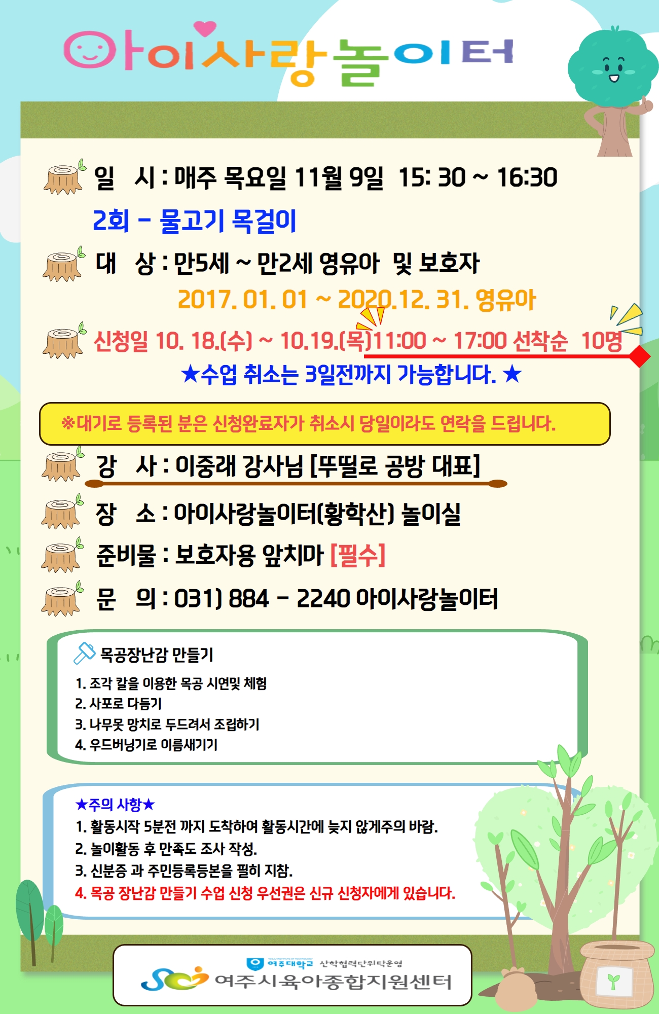 | ±âŸ»çÇ× | Áغñ¹° : º¸È£ÀÚ¿ë ¾ÕÄ¡¸¶ Áغñ, 3°³¿ù ÀÌÀü µîº» Çʼö *Ãë¼Ò½Ã ¹Ýµå½Ã ÀüÈ ¿¬¶ôÀ» ÁּžßÇϸç, Ãë¼Ò´Â Ȱµ¿ 3ÀÏÀü±îÁö¸¸ °¡´ÉÇÕ´Ï´Ù. *³îÀÌȰµ¿ ½Åû ÈÄ ¼ö¾÷¿¡ ºÒÂü½Ã ´ÙÀ½ ¸ðµç ¼ö¾÷¿¡ ½ÅûºÒ°¡. *½ÅûµÇ½Å ȸ¿øÀº È®Á¤ ¾È³» ¹®ÀÚ¸¦ µå¸³´Ï´Ù. *1°¡Á¤´ç ¾Æµ¿ 1¸í¸¸ ½Åû°¡´É(½ÖµÕÀÌ´Â ¿¹¿Ü ¹Ýµå½Ã º¸È£ÀÚ´Â °¢°¢ ¿À¼Å¾ß ÇÕ´Ï´Ù) ´ë±â·Î µî·ÏµÈ ºÐÀº ½Åû¿Ï·áÀÚ°¡ Ãë¼Ò½Ã ´çÀÏÀÌ¶óµµ ¿¬¶ôÀ» µå¸³´Ï´Ù. - ´ë±â½ÅûÀÚ¿¡°Ô ¿¬¶ô ÈÄ ºÎÀçÁ߽à 30ºÐÀ̳» ¿¬¶ôÀÌ ¾øÀ¸¸é ´ÙÀ½ ´ë±âÀÚ¿¡°Ô ±âȸ´Â ³Ñ¾î°¨ (´ë±âÀÚ¿¡°Ô º°µµÀÇ ¹®ÀÚ ¾È³»´Â ÇÏÁö ¾Ê½À´Ï´Ù.) |