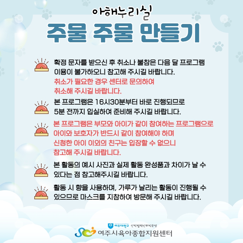 | ±âŸ»çÇ× | º» ÇÁ·Î±×·¥Àº ½ÅûÇÑ ¾ÆÀÌ¿Í º¸È£ÀÚ 1Àθ¸ Âü¼® °¡´ÉÇÕ´Ï´Ù.(º¸È£ÀÚ ÃÖ´ë 2ÀÎ) ½ÅûÀÚ ¿Ü¿£ Âü¿© ºÒ°¡ÇÕ´Ï´Ù. ½Åû È®Á¤ ¹®ÀÚ¸¦ ¼ö·ÉÇϽŠÈÄ Ãë¼Ò³ª °á¼®Àº ´ÙÀ½´Þ ÇÁ·Î±×·¥ À̿뿡 Á¦ÇÑµÉ ¼ö ÀÖÀ¸´Ï Âü°íÇØ ÁÖ½Ã±æ ¹Ù¶ø´Ï´Ù. ´ë±â·Î µî·ÏµÈ ºÐÀº ½Åû ¿Ï·áÀÚ°¡ Ãë¼Ò½Ã ´çÀÏÀÌ¶óµµ ¿¬¶ôÀ» µå¸³´Ï´Ù. |