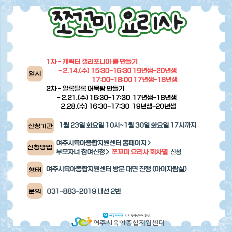 | ±âŸ»çÇ× | º» ÇÁ·Î±×·¥Àº ½ÅûÇÑ ¾ÆÀÌ¿Í º¸È£ÀÚ 1Àθ¸ Âü¼® °¡´ÉÇÕ´Ï´Ù.(º¸È£ÀÚ ÃÖ´ë 2ÀÎ) ½ÅûÀÚ ¿Ü¿£ Âü¿© ºÒ°¡ÇÕ´Ï´Ù. ½Åû È®Á¤ ¹®ÀÚ¸¦ ¼ö·ÉÇϽŠÈÄ Ãë¼Ò³ª °á¼®Àº ´ÙÀ½´Þ ÇÁ·Î±×·¥ À̿뿡 Á¦ÇÑµÉ ¼ö ÀÖÀ¸´Ï Âü°íÇØ ÁÖ½Ã±æ ¹Ù¶ø´Ï´Ù. ´ë±â·Î µî·ÏµÈ ºÐÀº ½Åû ¿Ï·áÀÚ°¡ Ãë¼Ò½Ã ´çÀÏÀÌ¶óµµ ¿¬¶ôÀ» µå¸³´Ï´Ù. |
