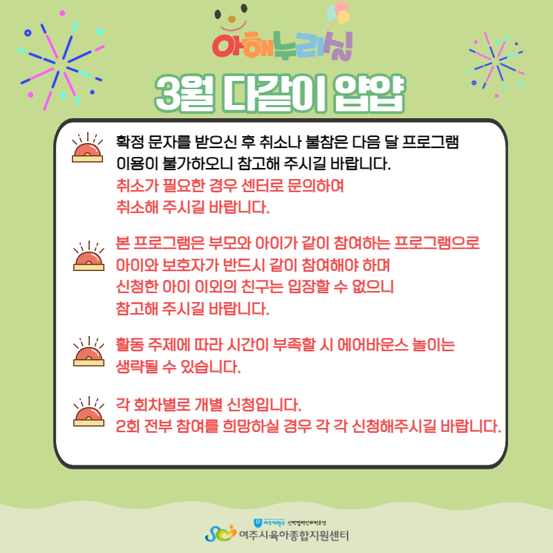 | ±âŸ»çÇ× | º» ÇÁ·Î±×·¥Àº ½ÅûÇÑ ¾ÆÀÌ¿Í º¸È£ÀÚ 1Àθ¸ Âü¼® °¡´ÉÇÕ´Ï´Ù.(º¸È£ÀÚ ÃÖ´ë 2ÀÎ) ½ÅûÀÚ ¿Ü¿£ Âü¿© ºÒ°¡ÇÕ´Ï´Ù. ½Åû È®Á¤ ¹®ÀÚ¸¦ ¼ö·ÉÇϽŠÈÄ Ãë¼Ò³ª °á¼®Àº ´ÙÀ½´Þ ÇÁ·Î±×·¥ À̿뿡 Á¦ÇÑµÉ ¼ö ÀÖÀ¸´Ï Âü°íÇØ ÁÖ½Ã±æ ¹Ù¶ø´Ï´Ù. ´ë±â·Î µî·ÏµÈ ºÐÀº ½Åû ¿Ï·áÀÚ°¡ Ãë¼Ò½Ã ´çÀÏÀÌ¶óµµ ¿¬¶ôÀ» µå¸³´Ï´Ù. |