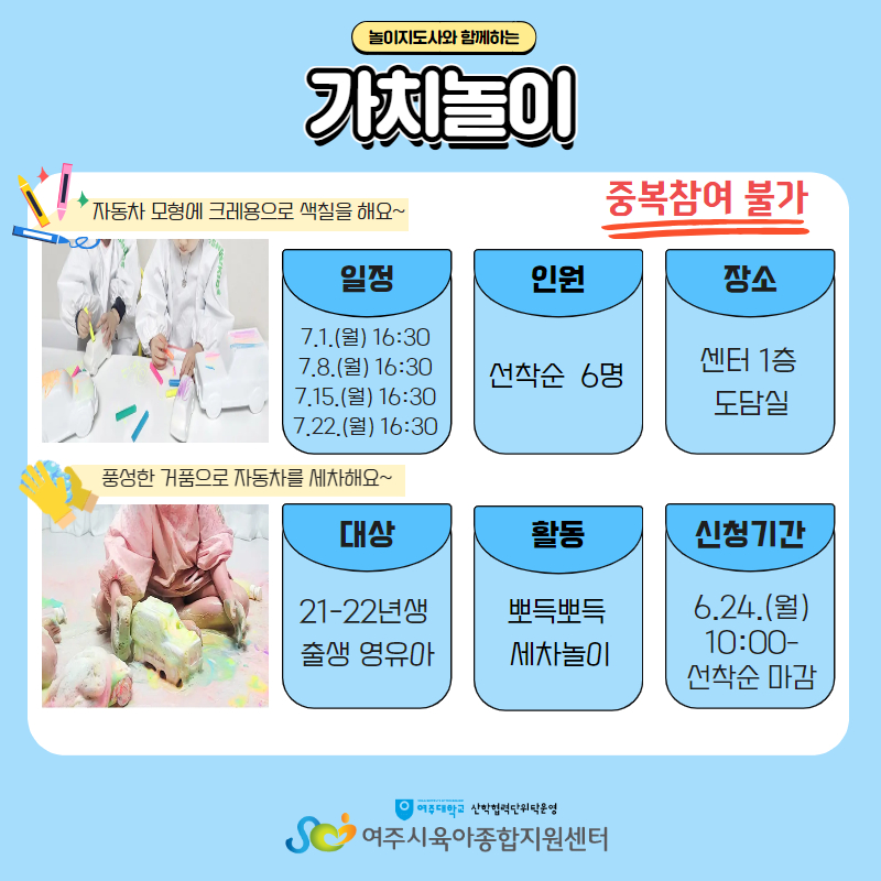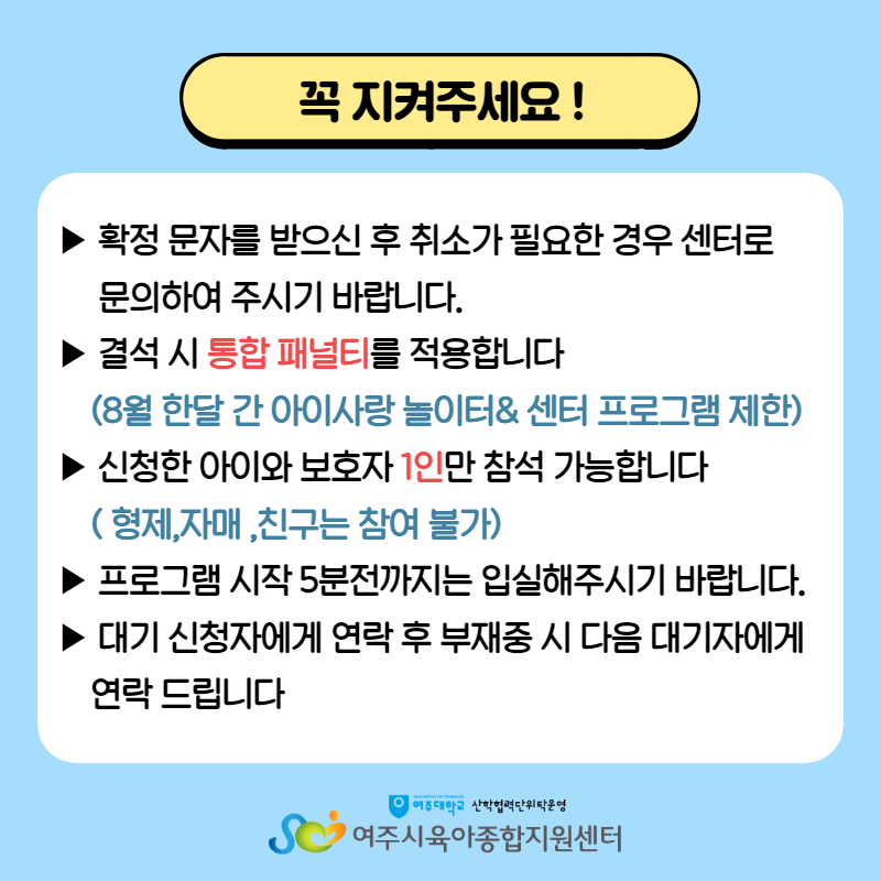 | ±âŸ»çÇ× | - ÁÖÂ÷ÀåÀÌ Çù¼ÒÇÏ´Ï 10ºÐÀü±îÁö µµÂøÇÏ¿© Ȱµ¿ ½Ã°£¿¡ ´ÊÁö ¾Êµµ·Ï ÁÖÀǹٶø´Ï´Ù. - º» ÇÁ·Î±×·¥Àº ½ÅûÇÑ ¾ÆÀÌ¿Í º¸È£ÀÚ 1Àθ¸ Âü¼®°¡´ÉÇÕ´Ï´Ù.(ÇüÁ¦,ÀڸŠÂü¿©ºÒ°¡) - ÇÁ·Î±×·¥ ´çÀÏ °á¼® ½Ã ÅëÇÕÆÐ³ÎÆ¼°¡ Àû¿ëµÇ´Ï À¯ÀÇÇØÁÖ¼¼¿ä - °á¼® ½Ã Áõºù¼·ù¸¦ ²À ÁöÂüÇØ ÁÖ¼Å¾ß Çϸç Ãë¼Ò³ª °á¼®½Ã ´ã´çÀÚ¿¡°Ô ¿¬¶ôÁֽñ⠹ٶø´Ï´Ù. - ´ë±âÀÚ´Â ½Åû ¼øÀ¸·Î ¿¬¶ôµå¸®¸ç ºÎÀçÁß ½Ã ´ÙÀ½ ´ë±âÀÚ¿¡°Ô ¿¬¶ôµå¸³´Ï´Ù. |