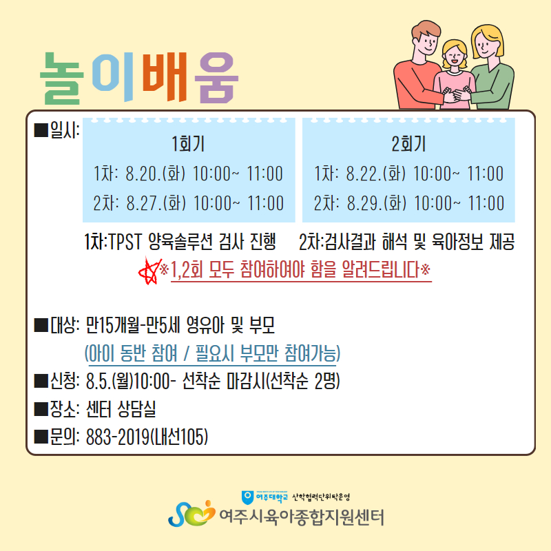 | ±âŸ»çÇ× | - ÁÖÂ÷ÀåÀÌ Çù¼ÒÇÏ¿À´Ï 10ºÐÀü±îÁö µµÂøÇÏ¿© Ȱµ¿ ½Ã°£¿¡ ´ÊÁö ¾Êµµ·Ï ÁÖÀǹٶø´Ï´Ù. - º» ÇÁ·Î±×·¥Àº ½ÅûÇÑ ¾ÆÀÌ1¸í°ú º¸È£ÀÚ 1Àθ¸ Âü¼®°¡´ÉÇÕ´Ï´Ù.(ÇüÁ¦,ÀڸŠÂü¿©ºÒ°¡) - ÇÁ·Î±×·¥ ´çÀÏ °á¼® ½Ã ÅëÇÕÆÐ³ÎÆ¼°¡ Àû¿ëµÇ´Ï À¯ÀÇÇØÁÖ¼¼¿ä(9¿ù ÇÑ´Þ °£ ¾ÆÀÌ»ç¶û ³îÀÌÅÍ& ¼¾ÅÍ ÇÁ·Î±×·¥ ÀÌ¿ëÁ¦ÇÑ) - °á¼® ½Ã Áõºù¼·ù¸¦ ²À ÁöÂüÇØ ÁÖ¼Å¾ß Çϸç Ãë¼Ò³ª °á¼®½Ã ´ã´çÀÚ¿¡°Ô ¿¬¶ôÁֽñ⠹ٶø´Ï´Ù. - ´ë±âÀÚ´Â ½Åû ¼øÀ¸·Î ¿¬¶ôµå¸®¸ç ºÎÀçÁß ½Ã ´ÙÀ½ ´ë±âÀÚ¿¡°Ô ¿¬¶ôµå¸³´Ï´Ù. |