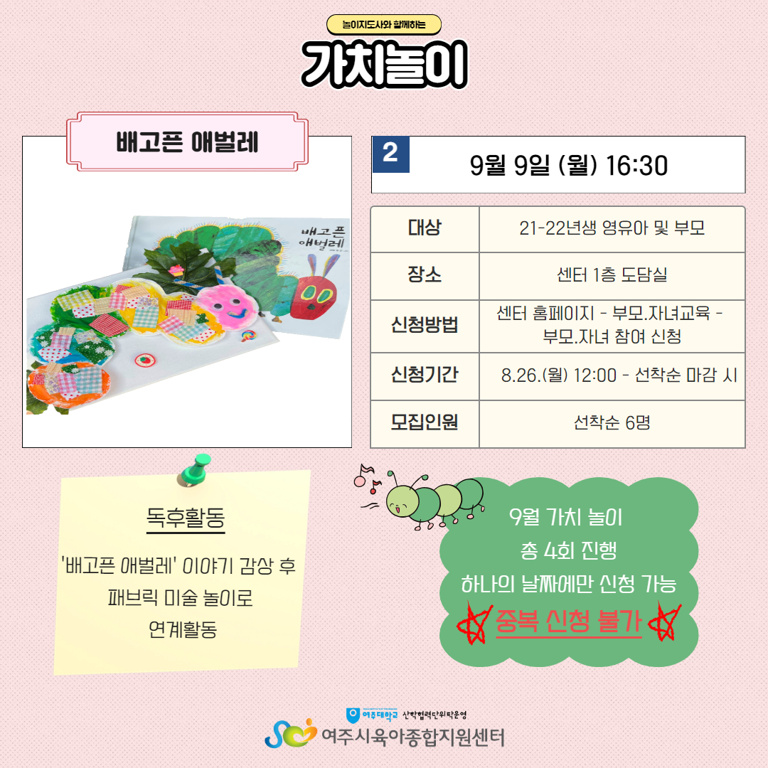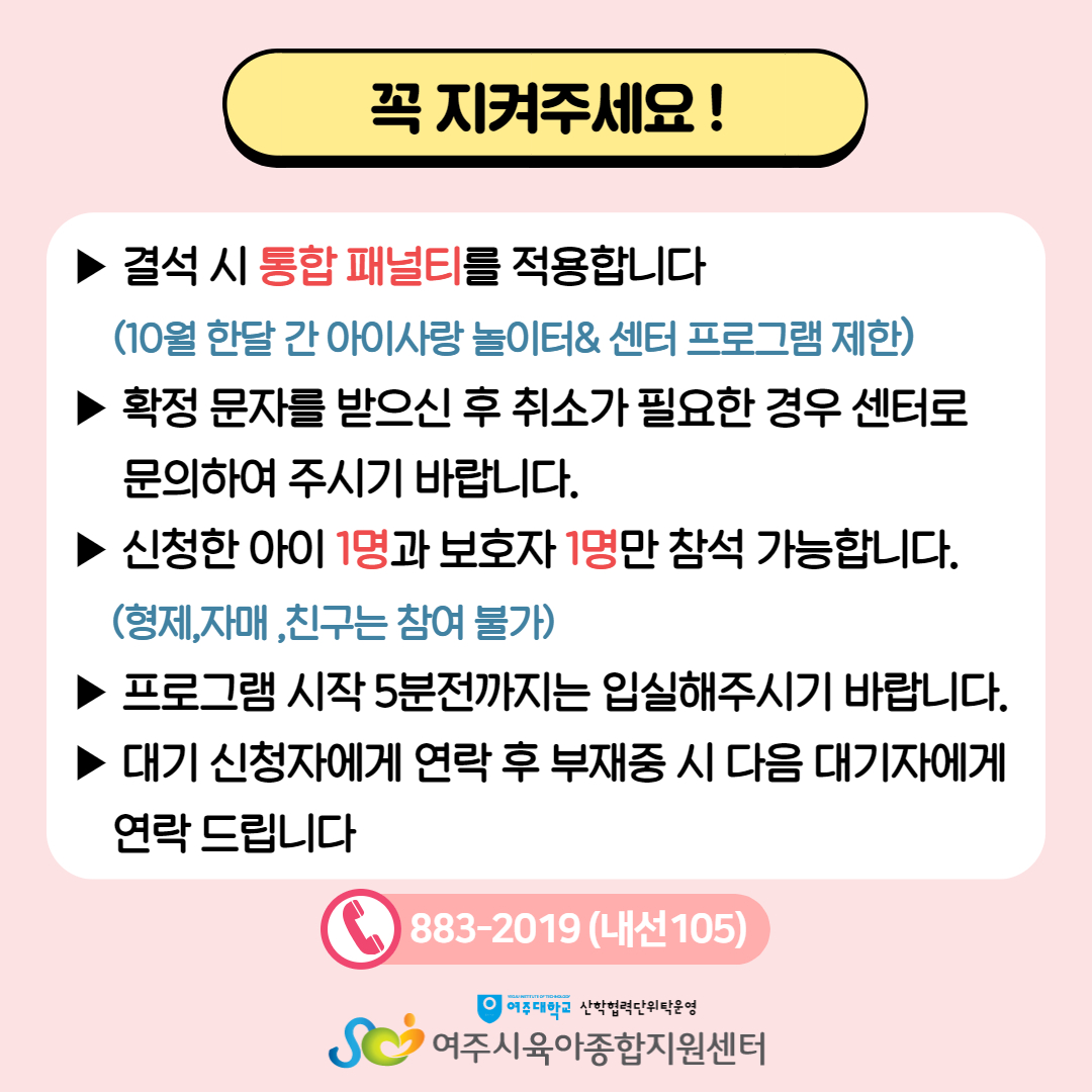 | ±âŸ»çÇ× | - ÁÖÂ÷ÀåÀÌ Çù¼ÒÇÏ¿À´Ï 5ºÐÀü±îÁö µµÂøÇÏ¿© Ȱµ¿ ½Ã°£¿¡ ´ÊÁö ¾Êµµ·Ï ÁÖÀǹٶø´Ï´Ù. - º» ÇÁ·Î±×·¥Àº ½ÅûÇÑ ¾ÆÀÌ1¸í°ú º¸È£ÀÚ 1Àθ¸ Âü¼®°¡´ÉÇÕ´Ï´Ù.(ÇüÁ¦,ÀڸŠÂü¿©ºÒ°¡) - ÇÁ·Î±×·¥ ´çÀÏ °á¼® ½Ã ÅëÇÕÆÐ³ÎÆ¼°¡ Àû¿ëµÇ´Ï À¯ÀÇÇØÁÖ¼¼¿ä(10¿ù ÇÑ´Þ °£ ¾ÆÀÌ»ç¶û ³îÀÌÅÍ& ¼¾ÅÍ ÇÁ·Î±×·¥ ÀÌ¿ëÁ¦ÇÑ) - °á¼® ½Ã Áõºù¼·ù¸¦ ²À ÁöÂüÇØ ÁÖ¼Å¾ß Çϸç Ãë¼Ò³ª °á¼®½Ã ´ã´çÀÚ¿¡°Ô ¿¬¶ôÁֽñ⠹ٶø´Ï´Ù. - ´ë±âÀÚ´Â ½Åû ¼øÀ¸·Î ¿¬¶ôµå¸®¸ç ºÎÀçÁß ½Ã ´ÙÀ½ ´ë±âÀÚ¿¡°Ô ¿¬¶ôµå¸³´Ï´Ù. - 1,2,3,4 Â÷ °°Àº ÁÖÁ¦·Î ÁøÇàµÇ¿À´Ï Áߺ¹ ½ÅûÀº ºÒ°¡ÇÕ´Ï´Ù. |