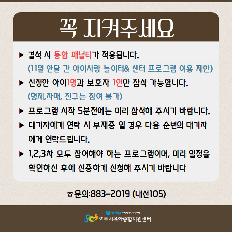 | ±âŸ»çÇ× | - º» ÇÁ·Î±×·¥Àº ½ÅûÇÑ ¾ÆÀÌ1¸í°ú º¸È£ÀÚ 1Àθ¸ Âü¼®°¡´ÉÇÕ´Ï´Ù.(ÇüÁ¦,ÀڸŠÂü¿©ºÒ°¡) - ÇÁ·Î±×·¥ ´çÀÏ °á¼® ½Ã ÅëÇÕÆÐ³ÎÆ¼°¡ Àû¿ëµÇ´Ï À¯ÀÇÇØÁÖ¼¼¿ä (11¿ù ÇÑ´Þ °£ ¾ÆÀÌ»ç¶û ³îÀÌÅÍ& ¼¾ÅÍ ÇÁ·Î±×·¥ ÀÌ¿ëÁ¦ÇÑ) - °á¼® ½Ã Áõºù¼·ù¸¦ ²À ÁöÂüÇØ ÁÖ¼Å¾ß Çϸç Ãë¼Ò³ª °á¼®½Ã ´ã´çÀÚ¿¡°Ô ¿¬¶ôÁֽñ⠹ٶø´Ï´Ù. - ´ë±âÀÚ´Â ½Åû ¼øÀ¸·Î ¿¬¶ôµå¸®¸ç ºÎÀçÁß ½Ã ´ÙÀ½ ´ë±âÀÚ¿¡°Ô ¿¬¶ôµå¸³´Ï´Ù. |