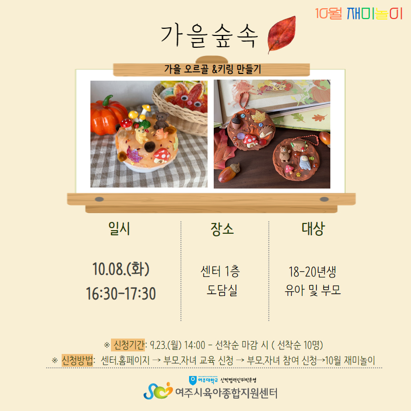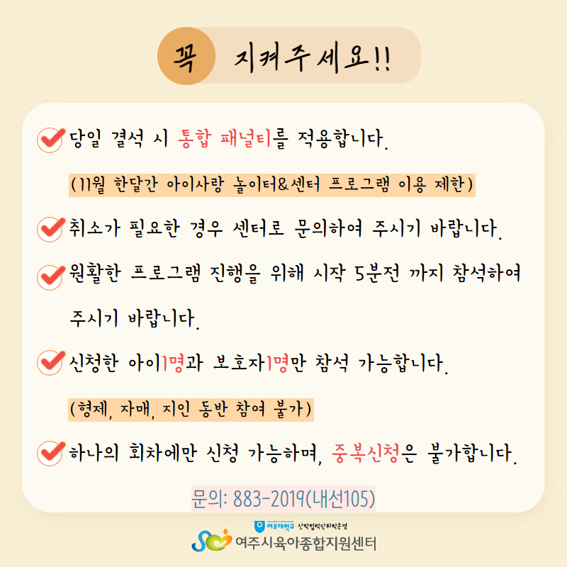 | ±âŸ»çÇ× | - º» ÇÁ·Î±×·¥Àº ½ÅûÇÑ ¾ÆÀÌ1¸í°ú º¸È£ÀÚ 1Àθ¸ Âü¼®°¡´ÉÇÕ´Ï´Ù.(ÇüÁ¦,ÀڸŠÂü¿©ºÒ°¡) - ÇÁ·Î±×·¥ ´çÀÏ °á¼® ½Ã ÅëÇÕÆÐ³ÎÆ¼°¡ Àû¿ëµÇ´Ï À¯ÀÇÇØÁÖ¼¼¿ä (11¿ù ÇÑ´Þ °£ ¾ÆÀÌ»ç¶û ³îÀÌÅÍ& ¼¾ÅÍ ÇÁ·Î±×·¥ ÀÌ¿ëÁ¦ÇÑ) - °á¼® ½Ã Áõºù¼·ù¸¦ ²À ÁöÂüÇØ ÁÖ¼Å¾ß Çϸç Ãë¼Ò³ª °á¼®½Ã ´ã´çÀÚ¿¡°Ô ¿¬¶ôÁֽñ⠹ٶø´Ï´Ù. - ´ë±âÀÚ´Â ½Åû ¼øÀ¸·Î ¿¬¶ôµå¸®¸ç ºÎÀçÁß ½Ã ´ÙÀ½ ´ë±âÀÚ¿¡°Ô ¿¬¶ôµå¸³´Ï´Ù. - 1,2,3,4 Â÷ °°Àº ÁÖÁ¦·Î ÁøÇàµÇ¿À´Ï Áߺ¹ ½ÅûÀº ºÒ°¡ÇÕ´Ï´Ù. |