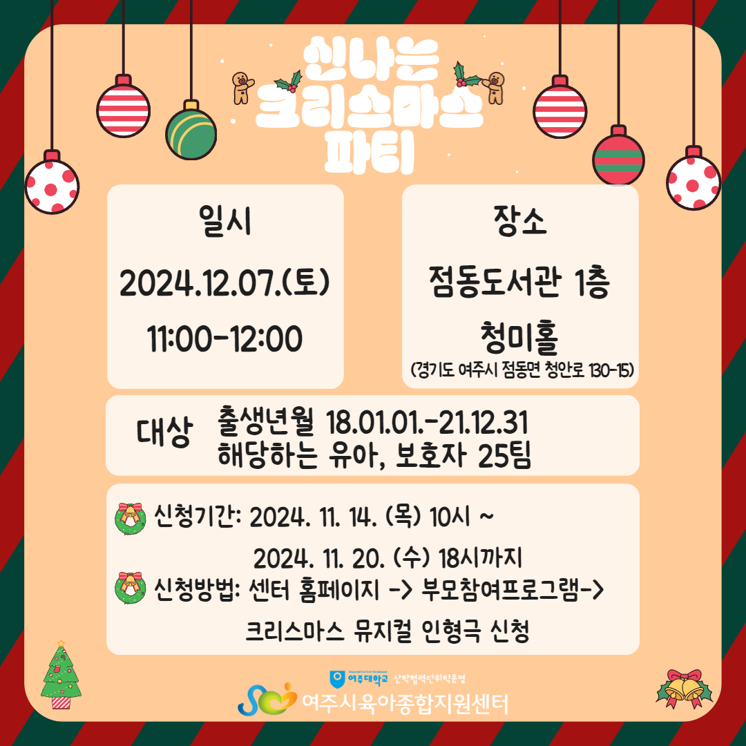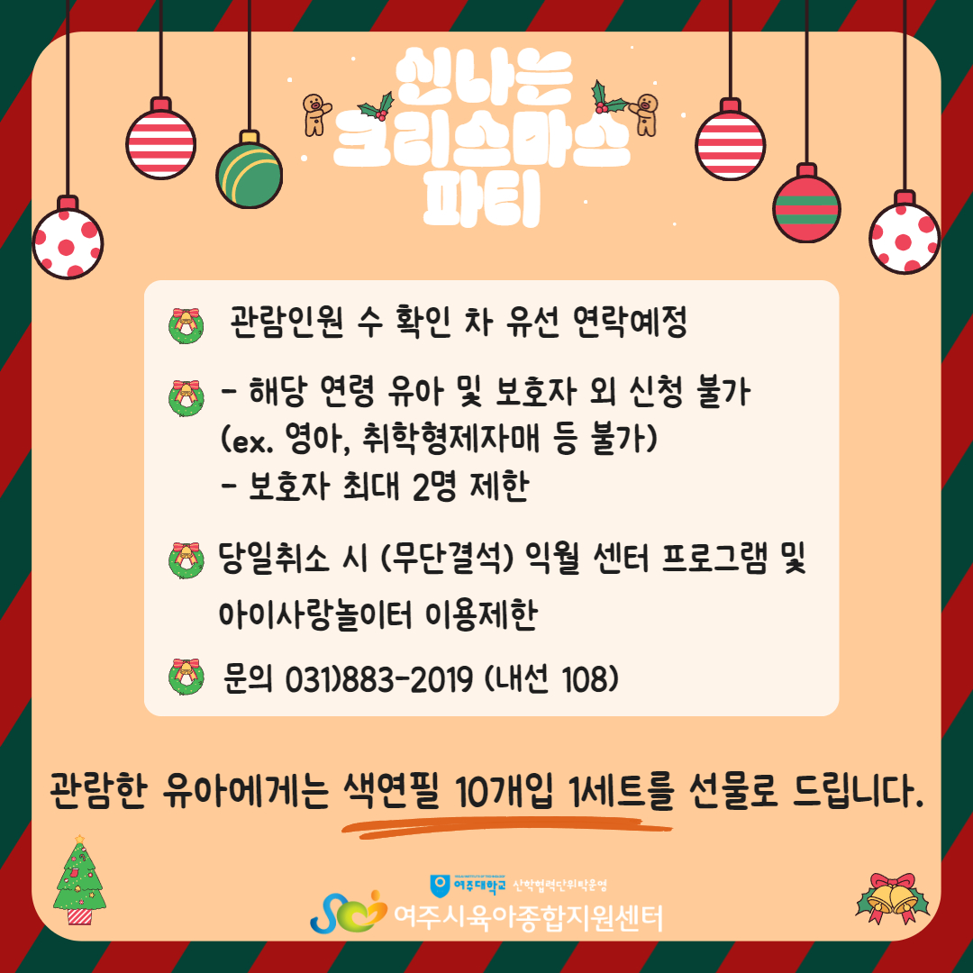| ±âŸ»çÇ× | ¡ÚÅ©¸®½º¸¶½º ±â³ä ¹ÂÁöÄà ÀÎÇü±Ø¡Ú - º¸È£ÀÚ´Â ÃÖ´ë 2¸í ½Åû °¡´É -ÇØ´ç ¿¬·É ½ÅûÀÚ¿Ü¿¡ ÀÔÀå ºÒ°¡ (¿µ¾Æ, ÃëÇÐ ÇüÁ¦, Àڸеî ÀÔÀå ºÒ°¡) -½Åû Á¤¿ø ¸ðÁý ÈÄ ´ë±â ¼øÀ¸·Î ¿¬¶ô µå¸³´Ï´Ù. -½Åû ¼ø¼´ë·Î ÀÚ¸®°¡ ¹èÄ¡ µÉ ¿¹Á¤ÀÔ´Ï´Ù. -ÀÔÀå 10ºÐÀü¿¡´Â °ø¿¬Àå¿¡ µµÂø Çϼż, ÀÚ¸® È®ÀÎ ¹Ù¶ø´Ï´Ù. -»ý¼ö ¿Ü¿¡ À½½Ä¹° ¹ÝÀÔ ±ÝÁö ÀÔ´Ï´Ù. ¡ÚÁؼö»çÇ×À» Àß ÁöÄÑÁÖ¼¼¿ä¡Ú |
