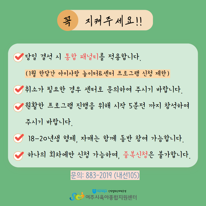 | ±âŸ»çÇ× | - ÇÁ·Î±×·¥ ´çÀÏ °á¼® ½Ã ÅëÇÕÆÐ³ÎÆ¼°¡ Àû¿ëµÇ´Ï À¯ÀÇÇØÁÖ¼¼¿ä (25³â 1¿ù ÇÑ´Þ °£ ¾ÆÀÌ»ç¶û ³îÀÌÅÍ& ¼¾ÅÍ ÇÁ·Î±×·¥ ½ÅûÁ¦ÇÑ) - °á¼® ½Ã Áõºù¼·ù¸¦ ²À ÁöÂüÇØ ÁÖ¼Å¾ß Çϸç Ãë¼Ò³ª °á¼®½Ã ´ã´çÀÚ¿¡°Ô ¿¬¶ôÁֽñ⠹ٶø´Ï´Ù. - ´ë±âÀÚ´Â ½Åû ¼øÀ¸·Î ¿¬¶ôµå¸®¸ç ºÎÀçÁß ½Ã ´ÙÀ½ ´ë±âÀÚ¿¡°Ô ¿¬¶ôµå¸³´Ï´Ù. - 1,2,3 ȸÂ÷ °°Àº ÁÖÁ¦·Î ÁøÇàµÇ¿À´Ï Áߺ¹ ½ÅûÀº ºÒ°¡ÇÕ´Ï´Ù. |