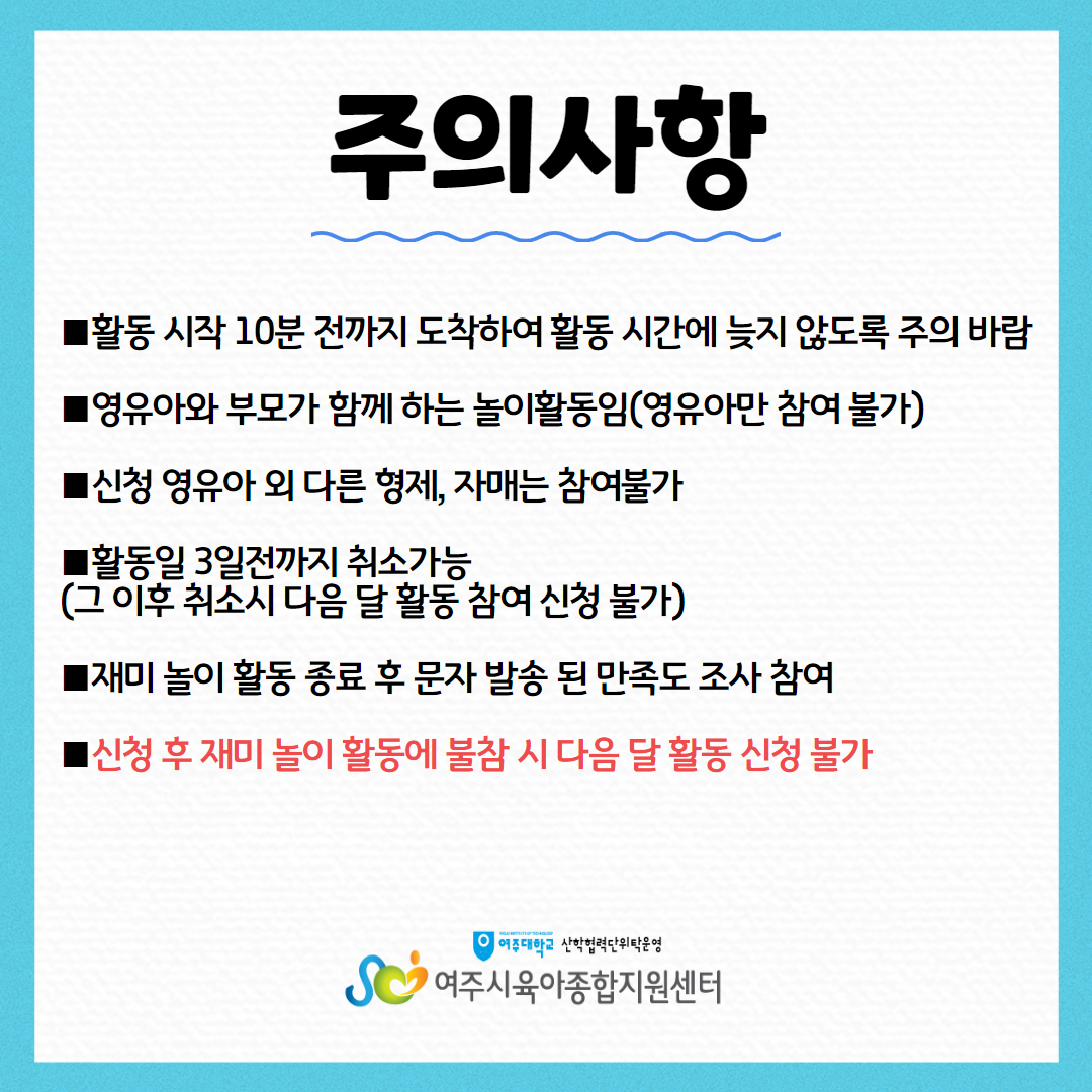 | ±âŸ»çÇ× | - º» ÇÁ·Î±×·¥Àº ½ÅûÇÑ ¾ÆÀÌ¿Í º¸È£ÀÚ 1Àθ¸ Âü¼®°¡´ÉÇÕ´Ï´Ù - ÇÁ·Î±×·¥ °á¼® ½Ã ´ÙÀ½ ´Þ ÇÁ·Î±×·¥ À̿뿡 Á¦ÇÑµÉ ¼ö ÀÖÀ¸´Ï Âü°íÇØ Áֽñ⠹ٶø´Ï´Ù. - ´ë±â·Î µî·ÏµÈ ºÐÀº ½Åû ¿Ï·áÀÚ°¡ Ãë¼Ò ½Ã ´çÀÏ ÀÌ¶óµµ ¿¬¶ôÀ» µå¸³´Ï´Ù. - ÇØ´ç ÇÁ·Î±×·¥ Áߺ¹ ½Åû ºÒ°¡ÇÏ¿À´Ï ÇÑ ³¯Â¥¿¡¸¸ ½Åû ºÎʵ右´Ï´Ù. |