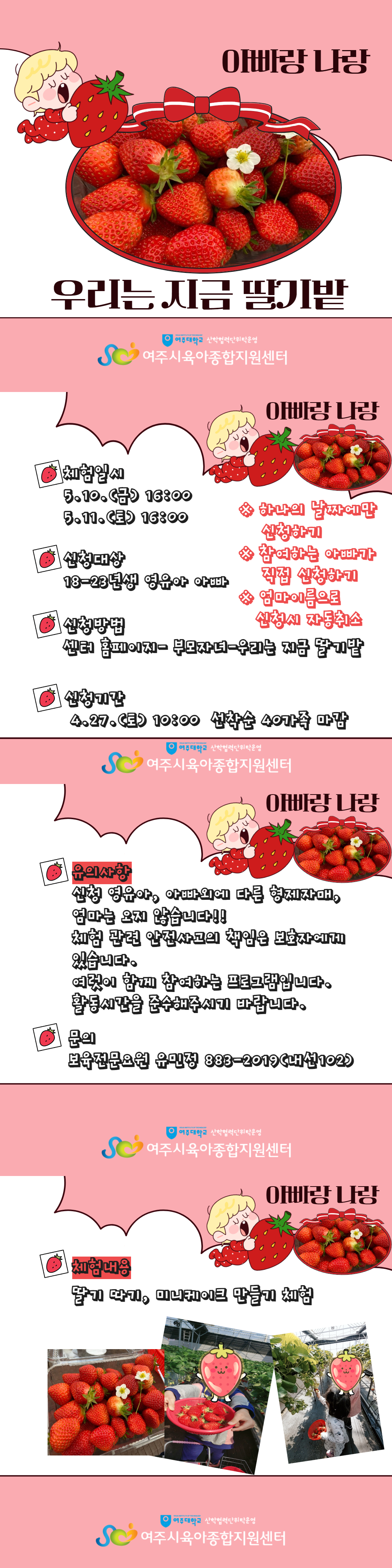 | ±âŸ»çÇ× | *** ¾ÆºüÀ̸§À¸·Î ½ÅûµÈ °Í¸¸ À¯È¿ÇÕ´Ï´Ù *** (¡Ø¾ö¸¶À̸§À¸·Î ½Åû¿Ï·áµÇ¾îµµ »çÀü¿¬¶ô¾øÀÌ ÀÚµ¿Ãë¼ÒµÊ) *** 5.10.(±Ý)°ú 5.11.(Åä) Áߺ¹½Åû ÇÏÁö ¾ÊÀ¸½Ã±â ¹Ù¶ø´Ï´Ù *** *** ¿µ¾ÆÀÇ °æ¿ì 2ÀÚ³à ¶Ç´Â ½ÖµÕÀÌÀÏ °æ¿ì ½Åû¿Ï·á µÇ¾îµµ Âü¿© ¾î·Æ½À´Ï´Ù ( ¾ö¸¶¿Ü¿¡ »ïÃÌ ¶Ç´Â ÇҾƹöÁö ¾çÀ°ÀÚ°¡ Âü¿©°¡´ÉÇÑ °æ¿ì¿¡ ½ÅÃ»ÇØÁֽñ⠹ٶø´Ï´Ù. ) ** À¯¾Æ´Â ¾Æºü 1¸í´ç 2ÀÚ³à Âü¿© °¡´ÉÇÕ´Ï´Ù *** *** ¿©ÇàÀÚº¸Çè °¡ÀÔÀ» À§ÇØ ¼¾ÅÍ À¯¼±¹øÈ£·Î ½ÅûÇϽŠ¾Æ¹ö´Ô²² ¿¬¶ôµå¸³´Ï´Ù. ¾ÆÀÌÀÇ ÁֹιøÈ£¿Í Âü¿©ÇÏ´Â ¾Æºü¾çÀ°ÀÚÀÇ ¹øÈ£¸¦ ¾Ë·ÁÁֽñ⠹ٶø´Ï´Ù *** |