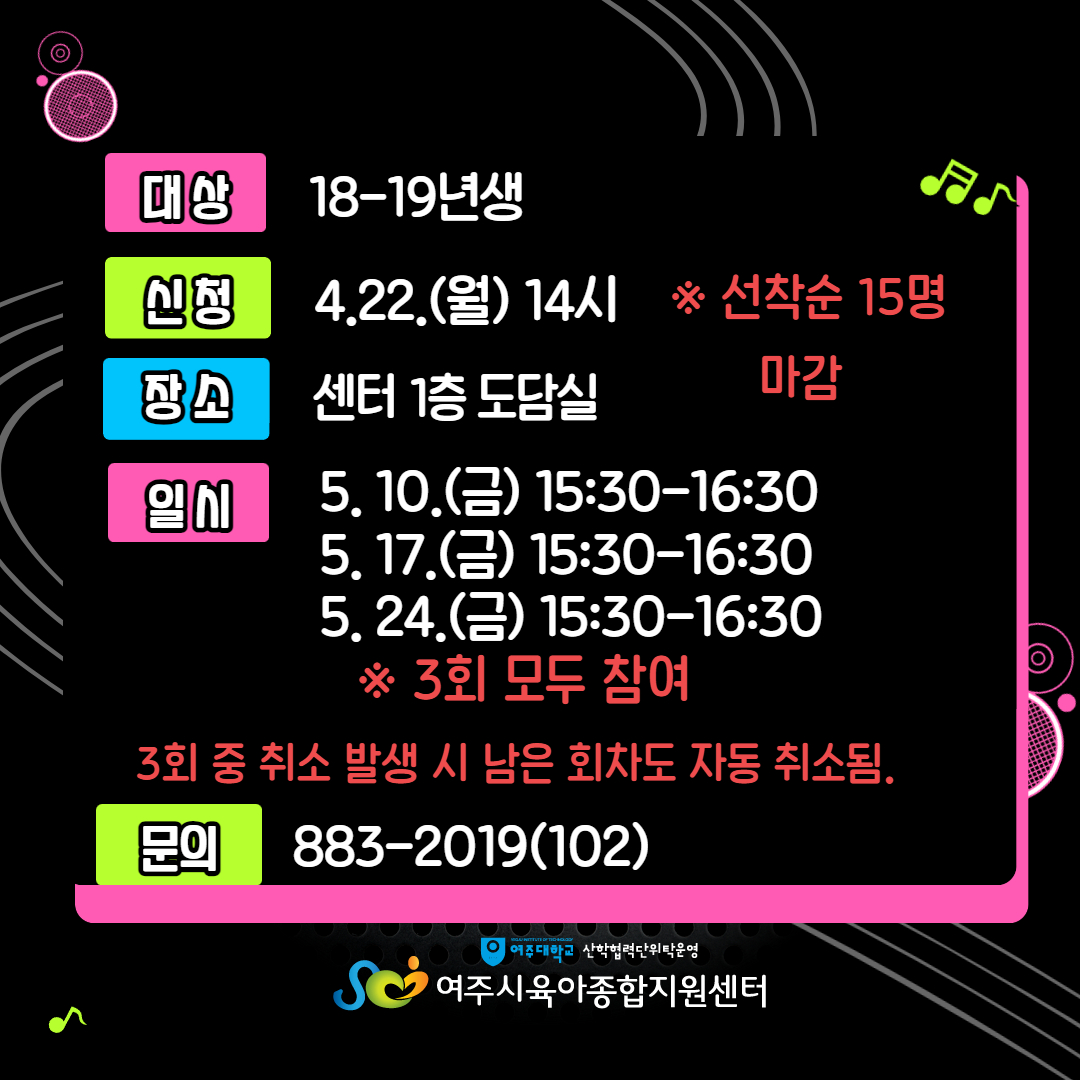 | ±âŸ»çÇ× | - ÁÖÂ÷ÀåÀÌ Çù¼ÒÇÏ´Ï 10ºÐÀü±îÁö µµÂøÇÏ¿© Ȱµ¿ ½Ã°£¿¡ ´ÊÁö ¾Êµµ·Ï ÁÖÀǹٶø´Ï´Ù. - º» ÇÁ·Î±×·¥Àº ¾ÆÀ̸¸ Âü¿©ÇÕ´Ï´Ù.(ÇüÁ¦,ÀڸŠÂü¿©ºÒ°¡) - ÇÁ·Î±×·¥ °á¼® ½Ã ´ÙÀ½ ´Þ ÇÁ·Î±×·¥ À̿뿡 Á¦ÇÑµÉ ¼ö ÀÖÀ¸´Ï Âü°íÇØ Áֽñ⠹ٶø´Ï´Ù. - ´ë±â·Î µî·ÏµÈ ºÐÀº ½Åû ¿Ï·áÀÚ°¡ Ãë¼Ò ½Ã ´çÀÏ ÀÌ¶óµµ ¿¬¶ôÀ» µå¸³´Ï´Ù. |