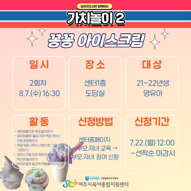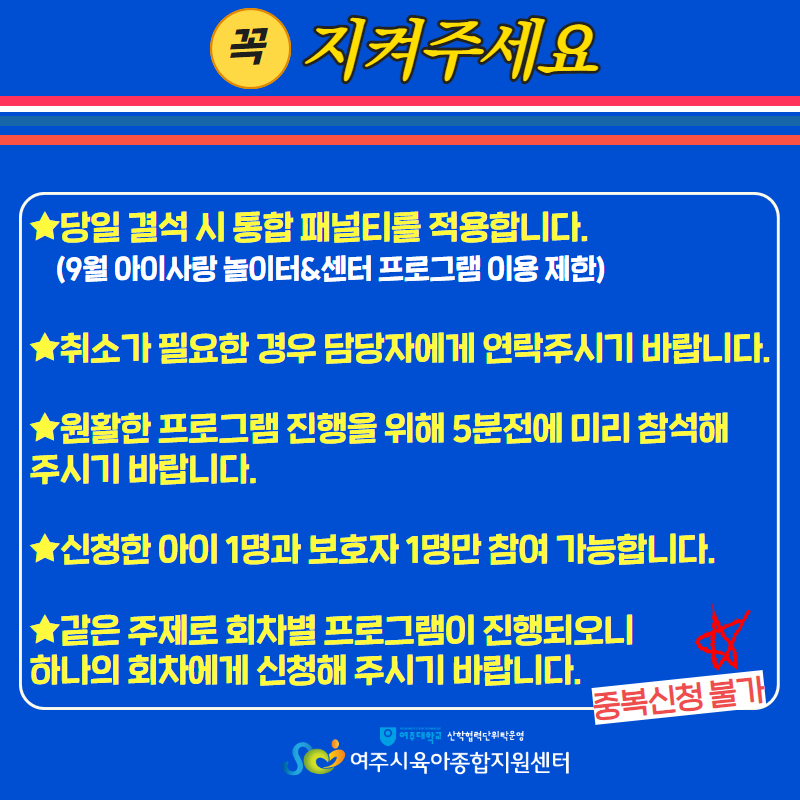 | ±âŸ»çÇ× | - ÁÖÂ÷ÀåÀÌ Çù¼ÒÇÏ¿À´Ï 10ºÐÀü±îÁö µµÂøÇÏ¿© Ȱµ¿ ½Ã°£¿¡ ´ÊÁö ¾Êµµ·Ï ÁÖÀǹٶø´Ï´Ù. - º» ÇÁ·Î±×·¥Àº ½ÅûÇÑ ¾ÆÀÌ1¸í°ú º¸È£ÀÚ 1Àθ¸ Âü¼®°¡´ÉÇÕ´Ï´Ù.(ÇüÁ¦,ÀڸŠÂü¿©ºÒ°¡) - ÇÁ·Î±×·¥ ´çÀÏ °á¼® ½Ã ÅëÇÕÆÐ³ÎÆ¼°¡ Àû¿ëµÇ´Ï À¯ÀÇÇØÁÖ¼¼¿ä(9¿ù ÇÑ´Þ °£ ¾ÆÀÌ»ç¶û ³îÀÌÅÍ& ¼¾ÅÍ ÇÁ·Î±×·¥ ÀÌ¿ëÁ¦ÇÑ) - °á¼® ½Ã Áõºù¼·ù¸¦ ²À ÁöÂüÇØ ÁÖ¼Å¾ß Çϸç Ãë¼Ò³ª °á¼®½Ã ´ã´çÀÚ¿¡°Ô ¿¬¶ôÁֽñ⠹ٶø´Ï´Ù. - ´ë±âÀÚ´Â ½Åû ¼øÀ¸·Î ¿¬¶ôµå¸®¸ç ºÎÀçÁß ½Ã ´ÙÀ½ ´ë±âÀÚ¿¡°Ô ¿¬¶ôµå¸³´Ï´Ù. |