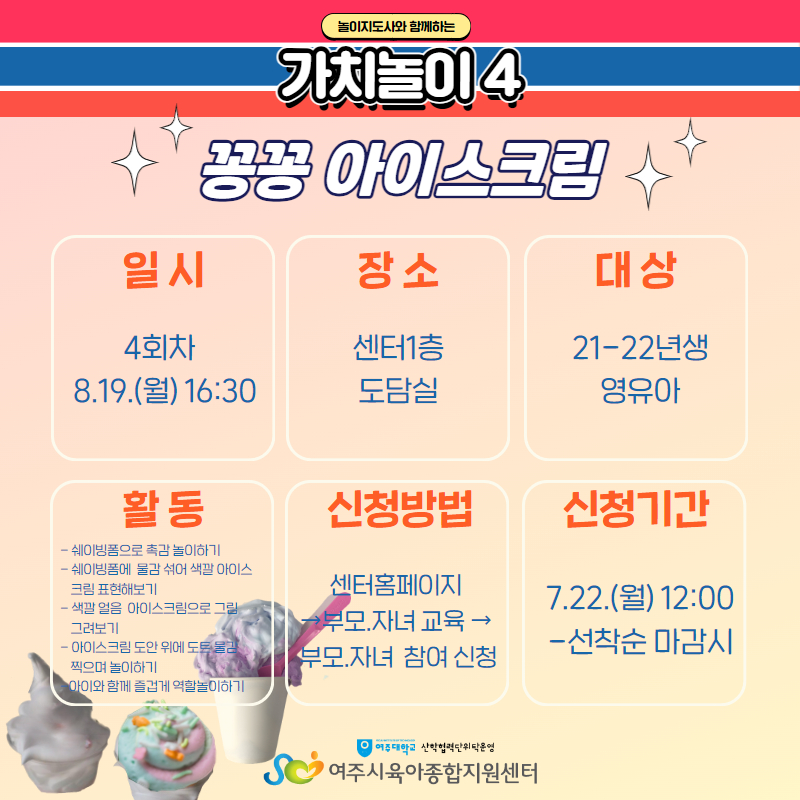 | ±âŸ»çÇ× | - ÁÖÂ÷ÀåÀÌ Çù¼ÒÇÏ¿À´Ï 10ºÐÀü±îÁö µµÂøÇÏ¿© Ȱµ¿ ½Ã°£¿¡ ´ÊÁö ¾Êµµ·Ï ÁÖÀǹٶø´Ï´Ù. - º» ÇÁ·Î±×·¥Àº ½ÅûÇÑ ¾ÆÀÌ1¸í°ú º¸È£ÀÚ 1Àθ¸ Âü¼®°¡´ÉÇÕ´Ï´Ù.(ÇüÁ¦,ÀڸŠÂü¿©ºÒ°¡) - ÇÁ·Î±×·¥ ´çÀÏ °á¼® ½Ã ÅëÇÕÆÐ³ÎÆ¼°¡ Àû¿ëµÇ´Ï À¯ÀÇÇØÁÖ¼¼¿ä(9¿ù ÇÑ´Þ °£ ¾ÆÀÌ»ç¶û ³îÀÌÅÍ& ¼¾ÅÍ ÇÁ·Î±×·¥ ÀÌ¿ëÁ¦ÇÑ) - °á¼® ½Ã Áõºù¼·ù¸¦ ²À ÁöÂüÇØ ÁÖ¼Å¾ß Çϸç Ãë¼Ò³ª °á¼®½Ã ´ã´çÀÚ¿¡°Ô ¿¬¶ôÁֽñ⠹ٶø´Ï´Ù. - ´ë±âÀÚ´Â ½Åû ¼øÀ¸·Î ¿¬¶ôµå¸®¸ç ºÎÀçÁß ½Ã ´ÙÀ½ ´ë±âÀÚ¿¡°Ô ¿¬¶ôµå¸³´Ï´Ù. |