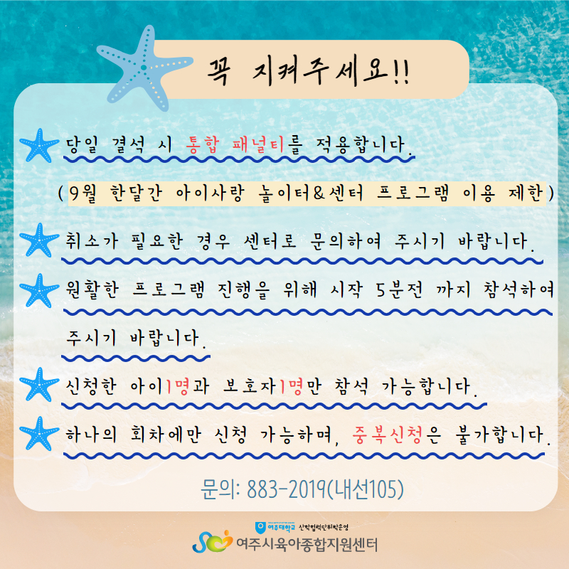 | ±âŸ»çÇ× | - ÁÖÂ÷ÀåÀÌ Çù¼ÒÇÏ¿À´Ï 10ºÐÀü±îÁö µµÂøÇÏ¿© Ȱµ¿ ½Ã°£¿¡ ´ÊÁö ¾Êµµ·Ï ÁÖÀǹٶø´Ï´Ù. - º» ÇÁ·Î±×·¥Àº ½ÅûÇÑ ¾ÆÀÌ1¸í°ú º¸È£ÀÚ 1Àθ¸ Âü¼®°¡´ÉÇÕ´Ï´Ù.(ÇüÁ¦,ÀڸŠÂü¿©ºÒ°¡) - ÇÁ·Î±×·¥ ´çÀÏ °á¼® ½Ã ÅëÇÕÆÐ³ÎÆ¼°¡ Àû¿ëµÇ´Ï À¯ÀÇÇØÁÖ¼¼¿ä(9¿ù ÇÑ´Þ °£ ¾ÆÀÌ»ç¶û ³îÀÌÅÍ& ¼¾ÅÍ ÇÁ·Î±×·¥ ÀÌ¿ëÁ¦ÇÑ) - °á¼® ½Ã Áõºù¼·ù¸¦ ²À ÁöÂüÇØ ÁÖ¼Å¾ß Çϸç Ãë¼Ò³ª °á¼®½Ã ´ã´çÀÚ¿¡°Ô ¿¬¶ôÁֽñ⠹ٶø´Ï´Ù. - ´ë±âÀÚ´Â ½Åû ¼øÀ¸·Î ¿¬¶ôµå¸®¸ç ºÎÀçÁß ½Ã ´ÙÀ½ ´ë±âÀÚ¿¡°Ô ¿¬¶ôµå¸³´Ï´Ù. |