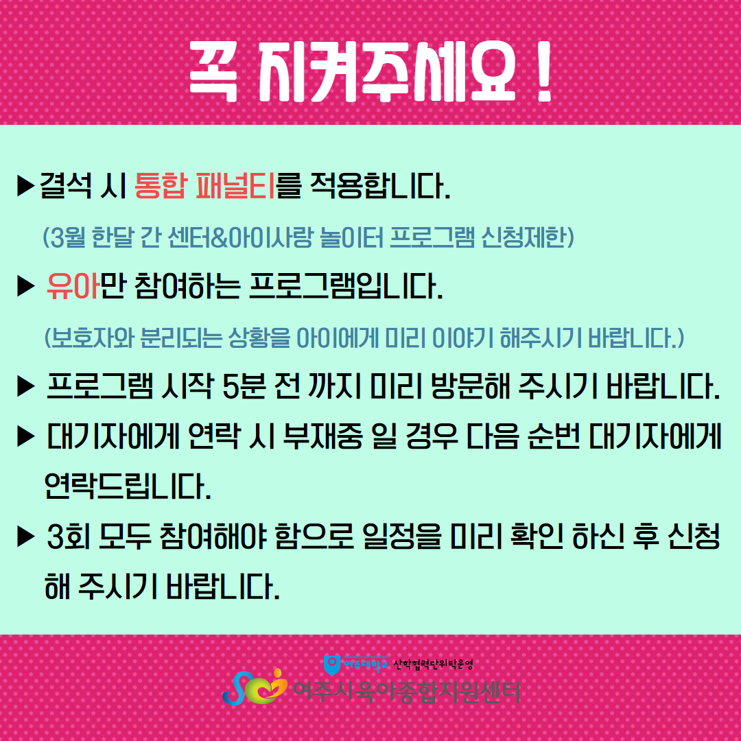 | ±âŸ»çÇ× | - ÇÁ·Î±×·¥ ´çÀÏ °á¼® ½Ã ÅëÇÕÆÐ³ÎÆ¼°¡ Àû¿ëµÇ´Ï À¯ÀÇÇØÁÖ¼¼¿ä (25³â 3¿ù ÇÑ´Þ °£ ¾ÆÀÌ»ç¶û ³îÀÌÅÍ& ¼¾ÅÍ ÇÁ·Î±×·¥ ½ÅûÁ¦ÇÑ) - °á¼® ½Ã Áõºù¼·ù¸¦ ²À ÁöÂüÇØ ÁÖ¼Å¾ß Çϸç Ãë¼Ò³ª °á¼®½Ã ´ã´çÀÚ¿¡°Ô ¿¬¶ôÁֽñ⠹ٶø´Ï´Ù. - ´ë±âÀÚ´Â ½Åû ¼øÀ¸·Î ¿¬¶ôµå¸®¸ç ºÎÀçÁß ½Ã ´ÙÀ½ ´ë±âÀÚ¿¡°Ô ¿¬¶ôµå¸³´Ï´Ù. |