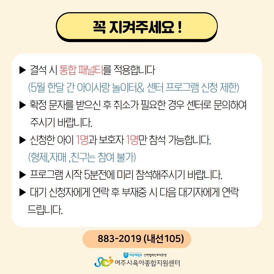 | ±âŸ»çÇ× | - ÁÖÂ÷ÀåÀÌ Çù¼ÒÇÏ¿À´Ï 5ºÐÀü±îÁö µµÂøÇÏ¿© Ȱµ¿ ½Ã°£¿¡ ´ÊÁö ¾Êµµ·Ï ÁÖÀǹٶø´Ï´Ù. - º» ÇÁ·Î±×·¥Àº ½ÅûÇÑ ¾ÆÀÌ1¸í°ú º¸È£ÀÚ 1Àθ¸ Âü¼®°¡´ÉÇÕ´Ï´Ù.(ÇüÁ¦,ÀڸŠÂü¿©ºÒ°¡) - ÇÁ·Î±×·¥ ´çÀÏ °á¼® ½Ã ÅëÇÕÆÐ³ÎÆ¼°¡ Àû¿ëµÇ´Ï À¯ÀÇÇØÁÖ¼¼¿ä (25³â 5¿ù ÇÑ´Þ °£ ¾ÆÀÌ»ç¶û ³îÀÌÅÍ& ¼¾ÅÍ ÇÁ·Î±×·¥ ½ÅûÁ¦ÇÑ) - °á¼® ½Ã Áõºù¼·ù¸¦ ²À ÁöÂüÇØ ÁÖ¼Å¾ß Çϸç Ãë¼Ò³ª °á¼®½Ã ´ã´çÀÚ¿¡°Ô ¿¬¶ôÁֽñ⠹ٶø´Ï´Ù. - ´ë±âÀÚ´Â ½Åû ¼øÀ¸·Î ¿¬¶ôµå¸®¸ç ºÎÀçÁß ½Ã ´ÙÀ½ ´ë±âÀÚ¿¡°Ô ¿¬¶ôµå¸³´Ï´Ù. - 1,2,3,4ȸ °°Àº ÁÖÁ¦·Î ÁøÇàµÇ¿À´Ï Áߺ¹ ½ÅûÀº ºÒ°¡ÇÕ´Ï´Ù. |