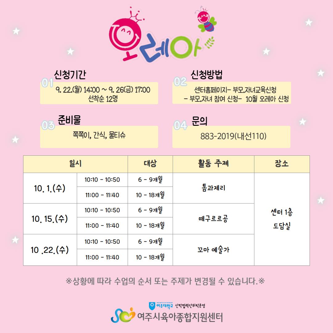 | ±âŸ»çÇ× | - ÁÖÂ÷ÀåÀÌ Çù¼ÒÇÏ¿À´Ï 5ºÐÀü±îÁö µµÂøÇÏ¿© Ȱµ¿ ½Ã°£¿¡ ´ÊÁö ¾Êµµ·Ï ÁÖÀǹٶø´Ï´Ù. - º» ÇÁ·Î±×·¥Àº ½ÅûÇÑ ¾ÆÀÌ1¸í°ú º¸È£ÀÚ 1Àθ¸ Âü¼®°¡´ÉÇÕ´Ï´Ù.(ÇüÁ¦,ÀڸŠÂü¿©ºÒ°¡) - ÇÁ·Î±×·¥ ´çÀÏ °á¼® ½Ã ÅëÇÕÆÐ³ÎÆ¼°¡ Àû¿ëµÇ´Ï À¯ÀÇÇØÁÖ¼¼¿ä (25³â 10¿ù ÇÑ´Þ °£ ¾ÆÀÌ»ç¶û ³îÀÌÅÍ& ¼¾ÅÍ ÇÁ·Î±×·¥ ½ÅûÁ¦ÇÑ) - °á¼® ½Ã Áõºù¼·ù¸¦ ²À ÁöÂüÇØ ÁÖ¼Å¾ß Çϸç Ãë¼Ò³ª °á¼®½Ã ´ã´çÀÚ¿¡°Ô ¿¬¶ôÁֽñ⠹ٶø´Ï´Ù. - ´ë±âÀÚ´Â ½Åû ¼øÀ¸·Î ¿¬¶ôµå¸®¸ç ºÎÀçÁß ½Ã ´ÙÀ½ ´ë±âÀÚ¿¡°Ô ¿¬¶ôµå¸³´Ï´Ù. - ´Ùȸ±â ÇÁ·Î±×·¥À¸·Î ÀÏÁ¤ È®ÀÎ ÈÄ Âü¿©°¡ ¸ðµÎ °¡´ÉÇϽаæ¿ì¿¡¸¸ ½ÅÃ»ÇØÁֽñ⠹ٶø´Ï´Ù. |