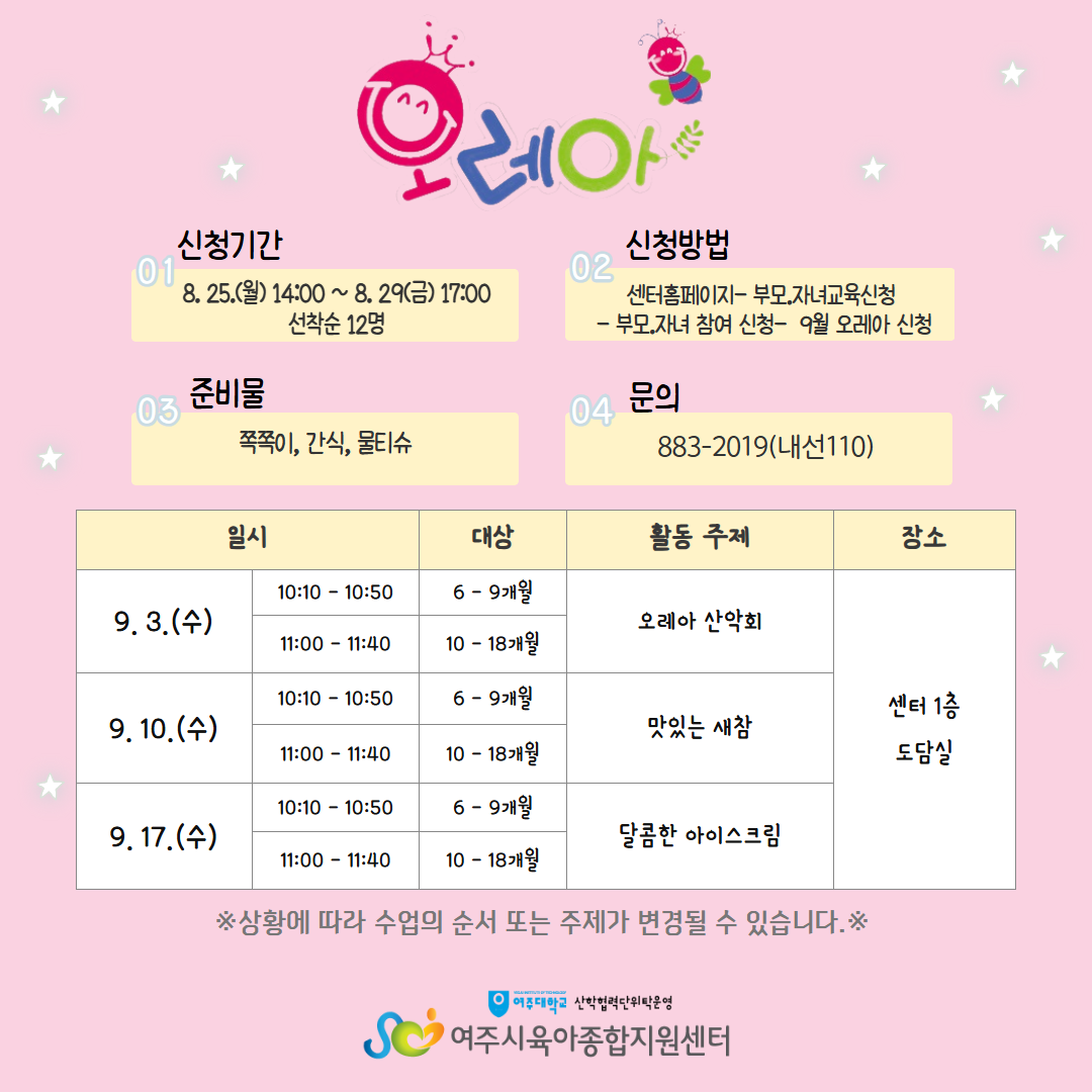 | ±âŸ»çÇ× | - ÁÖÂ÷ÀåÀÌ Çù¼ÒÇÏ¿À´Ï 5ºÐÀü±îÁö µµÂøÇÏ¿© Ȱµ¿ ½Ã°£¿¡ ´ÊÁö ¾Êµµ·Ï ÁÖÀǹٶø´Ï´Ù. - º» ÇÁ·Î±×·¥Àº ½ÅûÇÑ ¾ÆÀÌ1¸í°ú º¸È£ÀÚ 1Àθ¸ Âü¼®°¡´ÉÇÕ´Ï´Ù.(ÇüÁ¦,ÀڸŠÂü¿©ºÒ°¡) - ÇÁ·Î±×·¥ ´çÀÏ °á¼® ½Ã ÅëÇÕÆÐ³ÎÆ¼°¡ Àû¿ëµÇ´Ï À¯ÀÇÇØÁÖ¼¼¿ä (25³â 10¿ù ÇÑ´Þ °£ ¾ÆÀÌ»ç¶û ³îÀÌÅÍ& ¼¾ÅÍ ÇÁ·Î±×·¥ ½ÅûÁ¦ÇÑ) - °á¼® ½Ã Áõºù¼·ù¸¦ ²À ÁöÂüÇØ ÁÖ¼Å¾ß Çϸç Ãë¼Ò³ª °á¼®½Ã ´ã´çÀÚ¿¡°Ô ¿¬¶ôÁֽñ⠹ٶø´Ï´Ù. - ´ë±âÀÚ´Â ½Åû ¼øÀ¸·Î ¿¬¶ôµå¸®¸ç ºÎÀçÁß ½Ã ´ÙÀ½ ´ë±âÀÚ¿¡°Ô ¿¬¶ôµå¸³´Ï´Ù. - ´Ùȸ±â ÇÁ·Î±×·¥À¸·Î ÀÏÁ¤ È®ÀÎ ÈÄ Âü¿©°¡ ¸ðµÎ °¡´ÉÇϽаæ¿ì¿¡¸¸ ½ÅÃ»ÇØÁֽñ⠹ٶø´Ï´Ù. |