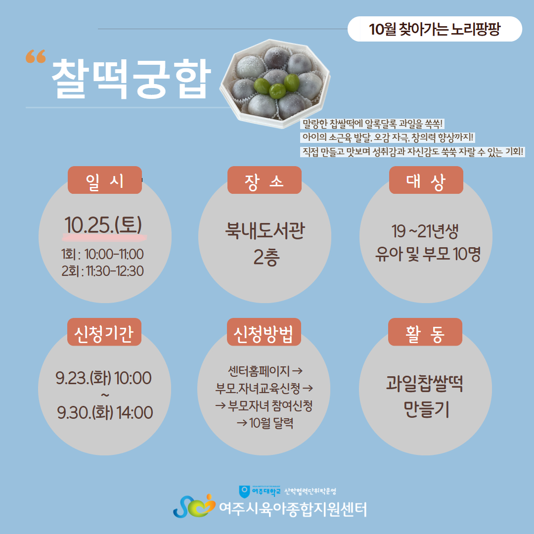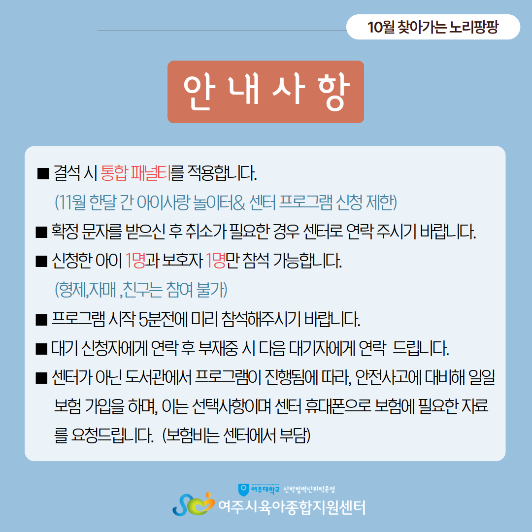 | ±âŸ»çÇ× | - º» ÇÁ·Î±×·¥Àº ½ÅûÇÑ ¾ÆÀÌ1¸í°ú º¸È£ÀÚ 1Àθ¸ Âü¼®°¡´ÉÇÕ´Ï´Ù.(ÇüÁ¦,ÀڸŠÂü¿©ºÒ°¡) - ÇÁ·Î±×·¥ ´çÀÏ °á¼® ½Ã ÅëÇÕÆÐ³ÎÆ¼°¡ Àû¿ëµÇ´Ï À¯ÀÇÇØÁÖ¼¼¿ä (25³â 11¿ù ÇÑ´Þ °£ ¾ÆÀÌ»ç¶û ³îÀÌÅÍ& ¼¾ÅÍ ÇÁ·Î±×·¥ ½ÅûÁ¦ÇÑ) - °á¼® ½Ã Áõºù¼·ù¸¦ ²À ÁöÂüÇØ ÁÖ¼Å¾ß Çϸç Ãë¼Ò³ª °á¼®½Ã ´ã´çÀÚ¿¡°Ô ¿¬¶ôÁֽñ⠹ٶø´Ï´Ù. - ´ë±âÀÚ´Â ½Åû ¼øÀ¸·Î ¿¬¶ôµå¸®¸ç ºÎÀçÁß ½Ã ´ÙÀ½ ´ë±âÀÚ¿¡°Ô ¿¬¶ôµå¸³´Ï´Ù. |
