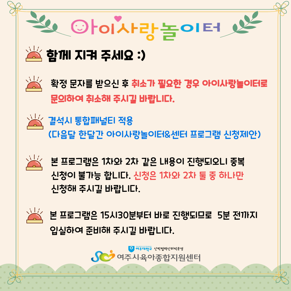 | ±âŸ»çÇ× | Áغñ¹° : 3°³¿ù ÀÌÀü µîº» Çʼö *Ãë¼Ò½Ã ¹Ýµå½Ã ÀüÈ ¿¬¶ôÀ» ÁÖ¼Å¾ß ÇÕ´Ï´Ù. * °á¼®½Ã ÅëÇÕÆÐ³ÎÆ¼ Àû¿ë (´ÙÀ½´Þ ÇÑ´Þ°£ ¾ÆÀÌ»ç¶û³îÀÌÅÍ& ¼¾ÅÍ ÇÁ·Î±×·¥ ½ÅûÁ¦ÇÑ) *½ÅûµÇ½Å ȸ¿øÀº È®Á¤ ¾È³» ¹®ÀÚ¸¦ µå¸³´Ï´Ù. *1°¡Á¤´ç ¾Æµ¿ 1¸í¸¸ ½Åû°¡´É(½ÖµÕÀÌ´Â ¿¹¿Ü ¹Ýµå½Ã º¸È£ÀÚ´Â °¢°¢ ¿À¼Å¾ß ÇÕ´Ï´Ù) ´ë±â·Î µî·ÏµÈ ºÐÀº ½Åû¿Ï·áÀÚ°¡ Ãë¼Ò½Ã ´çÀÏÀÌ¶óµµ ¿¬¶ôÀ» µå¸³´Ï´Ù. * ´ë±â½ÅûÀÚ¿¡°Ô ¿¬¶ô ÈÄ ºÎÀçÁ߽à 30ºÐÀ̳» ¿¬¶ôÀÌ ¾øÀ¸¸é ´ÙÀ½ ´ë±âÀÚ¿¡°Ô ±âȸ´Â ³Ñ¾î°¨ (´ë±âÀÚ¿¡°Ô º°µµÀÇ ¹®ÀÚ ¾È³»´Â ÇÏÁö ¾Ê½À´Ï´Ù.) |
