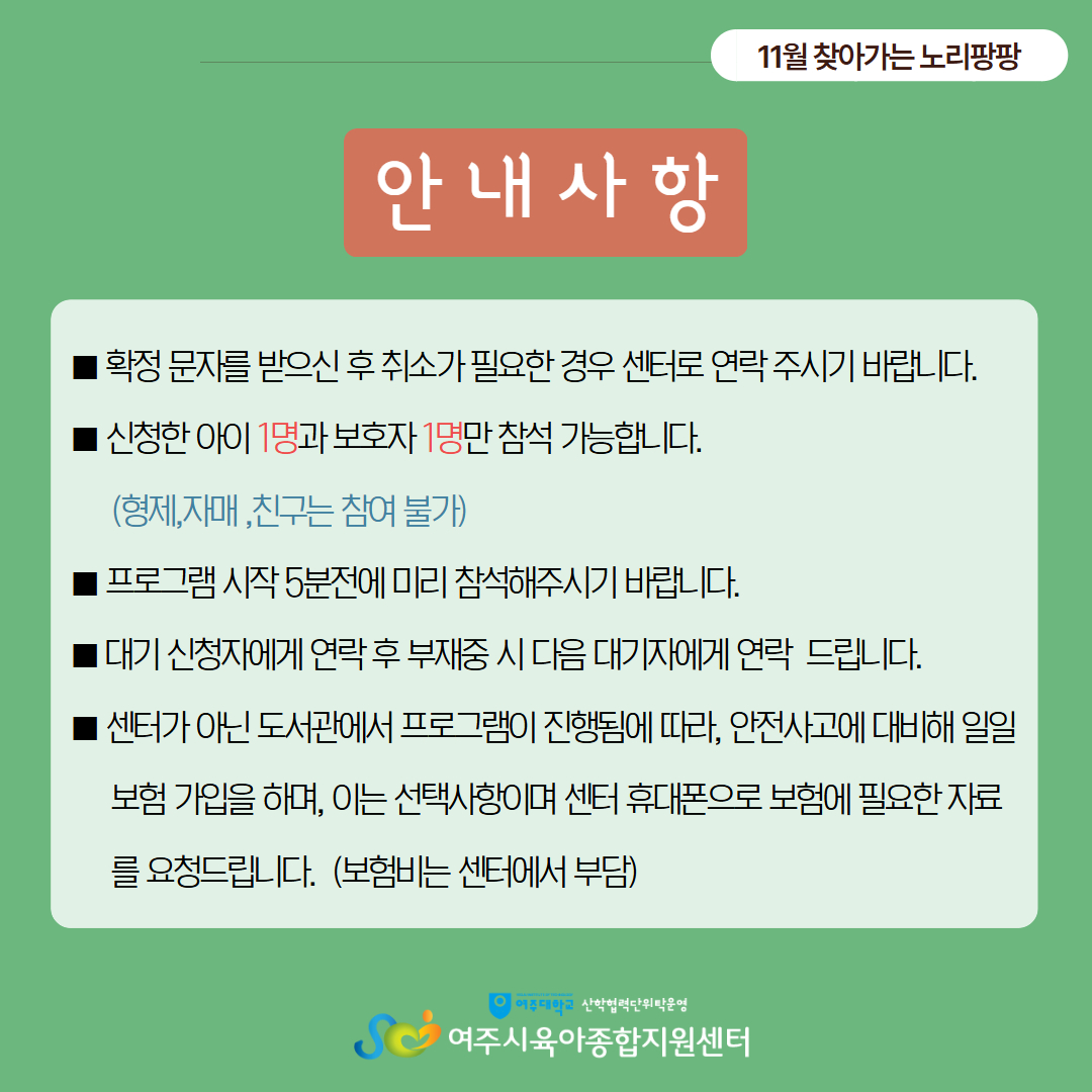 | ±âŸ»çÇ× | - º» ÇÁ·Î±×·¥Àº ½ÅûÇÑ ¾ÆÀÌ1¸í°ú º¸È£ÀÚ 1Àθ¸ Âü¼®°¡´ÉÇÕ´Ï´Ù.(ÇüÁ¦,ÀڸŠÂü¿©ºÒ°¡) - ÇÁ·Î±×·¥ ´çÀÏ °á¼® ½Ã ÅëÇÕÆÐ³ÎÆ¼°¡ Àû¿ëµÇ´Ï À¯ÀÇÇØÁÖ¼¼¿ä (25³â 12¿ù ÇÑ´Þ °£ ¾ÆÀÌ»ç¶û ³îÀÌÅÍ& ¼¾ÅÍ ÇÁ·Î±×·¥ ½Åû Á¦ÇÑ) - °á¼® ½Ã Áõºù¼·ù¸¦ ²À ÁöÂüÇØ ÁÖ¼Å¾ß Çϸç Ãë¼Ò³ª °á¼®½Ã ´ã´çÀÚ¿¡°Ô ¿¬¶ôÁֽñ⠹ٶø´Ï´Ù. - ´ë±âÀÚ´Â ½Åû ¼øÀ¸·Î ¿¬¶ôµå¸®¸ç ºÎÀçÁß ½Ã ´ÙÀ½ ´ë±âÀÚ¿¡°Ô ¿¬¶ôµå¸³´Ï´Ù. |