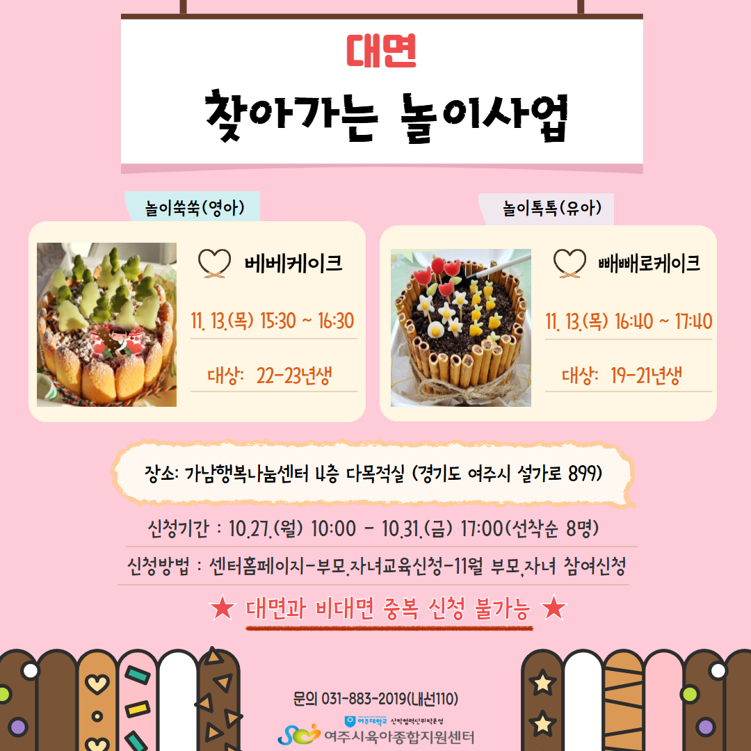 | ±âŸ»çÇ× | - ÁÖÂ÷ÀåÀÌ Çù¼ÒÇÏ¿À´Ï 5ºÐÀü±îÁö µµÂøÇÏ¿© Ȱµ¿ ½Ã°£¿¡ ´ÊÁö ¾Êµµ·Ï ÁÖÀǹٶø´Ï´Ù. - º» ÇÁ·Î±×·¥Àº ½ÅûÇÑ ¾ÆÀÌ1¸í°ú º¸È£ÀÚ 1Àθ¸ Âü¼®°¡´ÉÇÕ´Ï´Ù.(ÇüÁ¦,ÀڸŠÂü¿©ºÒ°¡) - ÇÁ·Î±×·¥ ´çÀÏ °á¼® ½Ã ÅëÇÕÆÐ³ÎÆ¼°¡ Àû¿ëµÇ´Ï À¯ÀÇÇØÁÖ¼¼¿ä (25³â 12¿ù ÇÑ´Þ °£ ¾ÆÀÌ»ç¶û ³îÀÌÅÍ& ¼¾ÅÍ ÇÁ·Î±×·¥ ½ÅûÁ¦ÇÑ) - °á¼® ½Ã Áõºù¼·ù¸¦ ²À ÁöÂüÇØ ÁÖ¼Å¾ß Çϸç Ãë¼Ò³ª °á¼®½Ã ´ã´çÀÚ¿¡°Ô ¿¬¶ôÁֽñ⠹ٶø´Ï´Ù. - ´ë±âÀÚ´Â ½Åû ¼øÀ¸·Î ¿¬¶ôµå¸®¸ç ºÎÀçÁß ½Ã ´ÙÀ½ ´ë±âÀÚ¿¡°Ô ¿¬¶ôµå¸³´Ï´Ù. - 10¿ù6ÀÏ(¸ñ), 10¿ù21ÀÏ(±Ý) Áߺ¹ ½Åû ºÒ°¡´ÉÇÕ´Ï´Ù. |