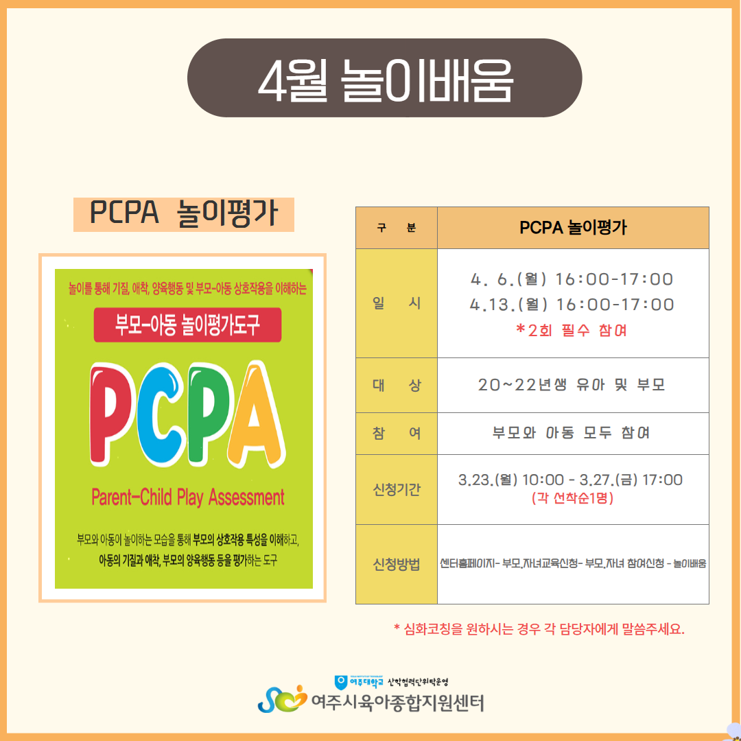 | ±âŸ»çÇ× | - ÁÖÂ÷ÀåÀÌ Çù¼ÒÇÏ¿À´Ï 5ºÐÀü±îÁö µµÂøÇÏ¿© »ó´ã ½Ã°£¿¡ ´ÊÁö ¾Êµµ·Ï ÁÖÀǹٶø´Ï´Ù. - º» ÇÁ·Î±×·¥Àº ½ÅûÇϽŠºÎ¸ð´Ô¸¸ Âü¿©ÇϽðųª ¾Æµ¿°ú ÇÔ²² µ¿¹ÝÇÏ¿© Âü¿© °¡´ÉÇÕ´Ï´Ù. - ÇÁ·Î±×·¥ ´çÀÏ °á¼® ½Ã ÅëÇÕÆÐ³ÎÆ¼°¡ Àû¿ëµÇ´Ï À¯ÀÇÇØÁÖ¼¼¿ä (5¿ù ÇÑ´Þ °£ ¾ÆÀÌ»ç¶û ³îÀÌÅÍ& ¼¾ÅÍ ÇÁ·Î±×·¥ ½ÅûÁ¦ÇÑ) - °á¼® ½Ã Áõºù¼·ù¸¦ ²À ÁöÂüÇØ ÁÖ¼Å¾ß Çϸç Ãë¼Ò³ª °á¼®½Ã ´ã´çÀÚ¿¡°Ô ¿¬¶ôÁֽñ⠹ٶø´Ï´Ù. - ´ë±âÀÚ´Â ½Åû ¼øÀ¸·Î ¿¬¶ôµå¸®¸ç ºÎÀçÁß ½Ã ´ÙÀ½ ´ë±âÀÚ¿¡°Ô ¿¬¶ôµå¸³´Ï´Ù. - µÎ ȸ±â ¸ðµÎ Âü¿©ÇÏ¼Å¾ß ÇÔÀ¸·Î ÀÏÁ¤ È®ÀÎ ÈÄ Âü¿©°¡ ¸ðµÎ °¡´ÉÇϽаæ¿ì¿¡¸¸ ½ÅÃ»ÇØÁֽñ⠹ٶø´Ï´Ù. |