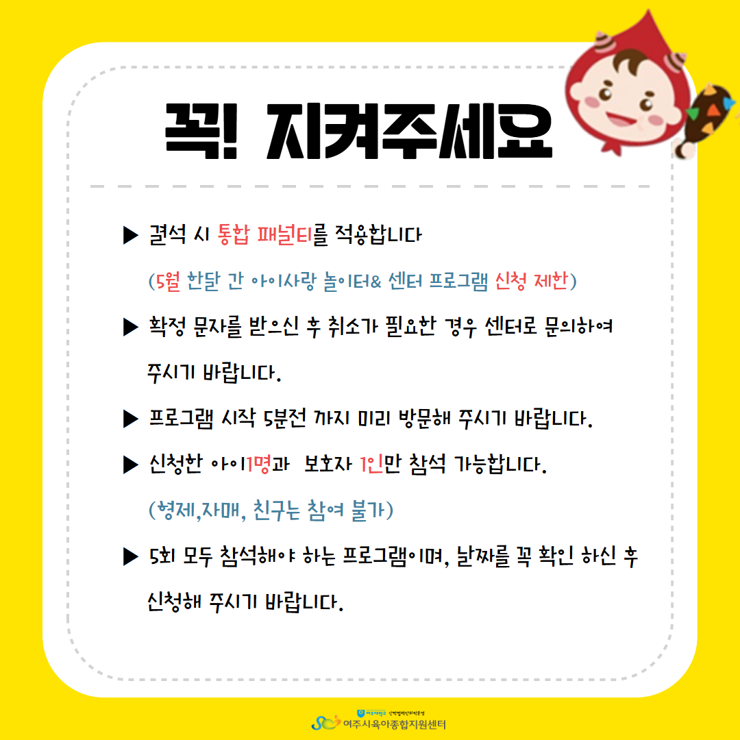 | ±âŸ»çÇ× | - ÁÖÂ÷ÀåÀÌ Çù¼ÒÇÏ¿À´Ï 5ºÐÀü±îÁö µµÂøÇÏ¿© Ȱµ¿ ½Ã°£¿¡ ´ÊÁö ¾Êµµ·Ï ÁÖÀǹٶø´Ï´Ù. - º» ÇÁ·Î±×·¥Àº ½ÅûÇÑ ¾ÆÀÌ1¸í°ú º¸È£ÀÚ 1Àθ¸ Âü¼®°¡´ÉÇÕ´Ï´Ù.(ÇüÁ¦,ÀڸŠÂü¿©ºÒ°¡) - ÇÁ·Î±×·¥ ´çÀÏ °á¼® ½Ã ÅëÇÕÆÐ³ÎÆ¼°¡ Àû¿ëµÇ´Ï À¯ÀÇÇØÁÖ¼¼¿ä (26³â 5¿ù ÇÑ´Þ °£ ¾ÆÀÌ»ç¶û ³îÀÌÅÍ& ¼¾ÅÍ ÇÁ·Î±×·¥ ½ÅûÁ¦ÇÑ) - °á¼® ½Ã Áõºù¼·ù¸¦ ²À ÁöÂüÇØ ÁÖ¼Å¾ß Çϸç Ãë¼Ò³ª °á¼®½Ã ´ã´çÀÚ¿¡°Ô ¿¬¶ôÁֽñ⠹ٶø´Ï´Ù. - ´ë±âÀÚ´Â ½Åû ¼øÀ¸·Î ¿¬¶ôµå¸®¸ç ºÎÀçÁß ½Ã ´ÙÀ½ ´ë±âÀÚ¿¡°Ô ¿¬¶ôµå¸³´Ï´Ù. - ´Ùȸ±â ÇÁ·Î±×·¥À¸·Î ÀÏÁ¤ È®ÀÎ ÈÄ Âü¿©°¡ ¸ðµÎ °¡´ÉÇϽаæ¿ì¿¡¸¸ ½ÅÃ»ÇØÁֽñ⠹ٶø´Ï´Ù. |