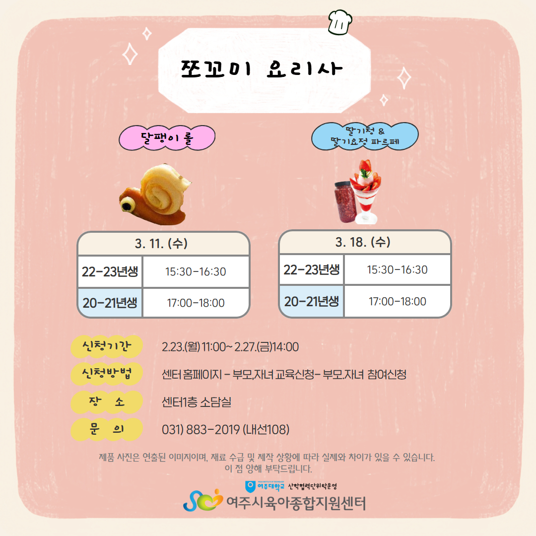 | (20-21³â»ý) Âɲ¿¹Ì ¿ä¸®»ç [´ÞÆØÀÌ ·Ñ] 3.11.(¼ö) 17:00 | |||