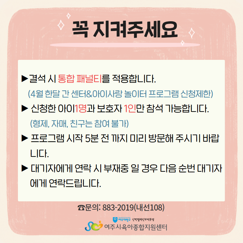 | ±âŸ»çÇ× | - ÁÖÂ÷ÀåÀÌ Çù¼ÒÇÏ¿À´Ï 5ºÐÀü±îÁö µµÂøÇÏ¿© Ȱµ¿ ½Ã°£¿¡ ´ÊÁö ¾Êµµ·Ï ÁÖÀǹٶø´Ï´Ù. <¼¾ÅÍ ÁÖÂ÷Àå ¸¸Â÷ ½Ã ¼¾ÅÍ ¿· ¿©Èﵿ °ø¿ë ÁÖÂ÷Àå ÀÌ¿ë. (µµº¸ 1ºÐ ¼Ò¿ä) / ÃÖÃÊ 60ºÐ ¹«·á, 60ºÐ Ãʰú ½Ã 10ºÐ´ç 200¿ø, ÀÏÀÏ ÃÖ´ë 6,000¿ø> - º» ÇÁ·Î±×·¥Àº ½ÅûÇÑ ¾ÆÀÌ1¸í°ú º¸È£ÀÚ 1Àθ¸ Âü¼®°¡´ÉÇÕ´Ï´Ù.(ÇüÁ¦,ÀڸŠÂü¿©ºÒ°¡) - ÇÁ·Î±×·¥ ´çÀÏ °á¼® ½Ã ÅëÇÕÆÐ³ÎÆ¼°¡ Àû¿ëµÇ´Ï À¯ÀÇÇØÁÖ¼¼¿ä (26³â 4¿ù ÇÑ´Þ °£ ¾ÆÀÌ»ç¶û ³îÀÌÅÍ& ¼¾ÅÍ ÇÁ·Î±×·¥ ½ÅûÁ¦ÇÑ) - °á¼® ½Ã Áõºù¼·ù¸¦ ²À ÁöÂüÇØ ÁÖ¼Å¾ß Çϸç Ãë¼Ò³ª °á¼®½Ã ´ã´çÀÚ¿¡°Ô ¿¬¶ôÁֽñ⠹ٶø´Ï´Ù. - ´ë±âÀÚ´Â ½Åû ¼øÀ¸·Î ¿¬¶ôµå¸®¸ç ºÎÀçÁß ½Ã ´ÙÀ½ ´ë±âÀÚ¿¡°Ô ¿¬¶ôµå¸³´Ï´Ù. |