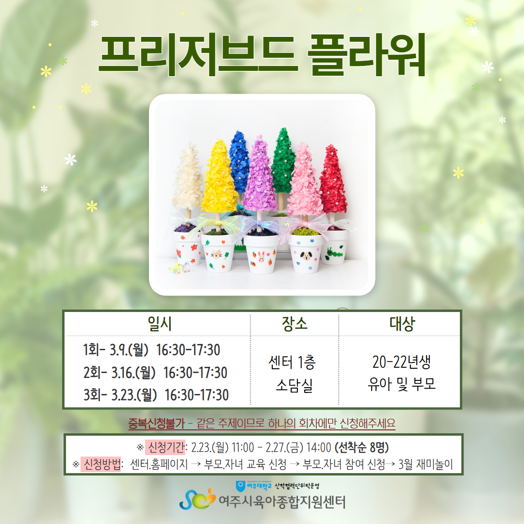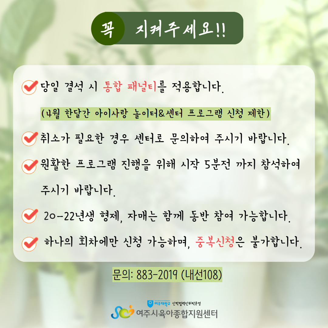 | ±âŸ»çÇ× | - ÁÖÂ÷ÀåÀÌ Çù¼ÒÇÏ¿À´Ï 5ºÐÀü±îÁö µµÂøÇÏ¿© Ȱµ¿ ½Ã°£¿¡ ´ÊÁö ¾Êµµ·Ï ÁÖÀǹٶø´Ï´Ù. <¼¾ÅÍ ÁÖÂ÷Àå ¸¸Â÷ ½Ã ¼¾ÅÍ ¿· ¿©Èﵿ °ø¿ë ÁÖÂ÷Àå ÀÌ¿ë. (µµº¸ 1ºÐ ¼Ò¿ä) / ÃÖÃÊ 60ºÐ ¹«·á, 60ºÐ Ãʰú ½Ã 10ºÐ´ç 200¿ø, ÀÏÀÏ ÃÖ´ë 6,000¿ø> - º» ÇÁ·Î±×·¥Àº 19-21³â»ý ÇüÁ¦,ÀڸŰ¡ µ¿¹Ý Âü¿© °¡´ÉÇÕ´Ï´Ù. - ÇÁ·Î±×·¥ ´çÀÏ °á¼® ½Ã ÅëÇÕÆÐ³ÎÆ¼°¡ Àû¿ëµÇ´Ï À¯ÀÇÇØÁÖ¼¼¿ä (4¿ù ÇÑ´Þ °£ ¾ÆÀÌ»ç¶û ³îÀÌÅÍ& ¼¾ÅÍ ÇÁ·Î±×·¥ ½ÅûÁ¦ÇÑ) - °á¼® ½Ã Áõºù¼·ù¸¦ ²À ÁöÂüÇØ ÁÖ¼Å¾ß Çϸç Ãë¼Ò³ª °á¼®½Ã ´ã´çÀÚ¿¡°Ô ¿¬¶ôÁֽñ⠹ٶø´Ï´Ù. - ´ë±âÀÚ´Â ½Åû ¼øÀ¸·Î ¿¬¶ôµå¸®¸ç ºÎÀçÁß ½Ã ´ÙÀ½ ´ë±âÀÚ¿¡°Ô ¿¬¶ôµå¸³´Ï´Ù. - 1,2,3ȸ °°Àº ÁÖÁ¦·Î ÁøÇàµÇ¿À´Ï Áߺ¹ ½ÅûÀº ºÒ°¡ÇÕ´Ï´Ù. |