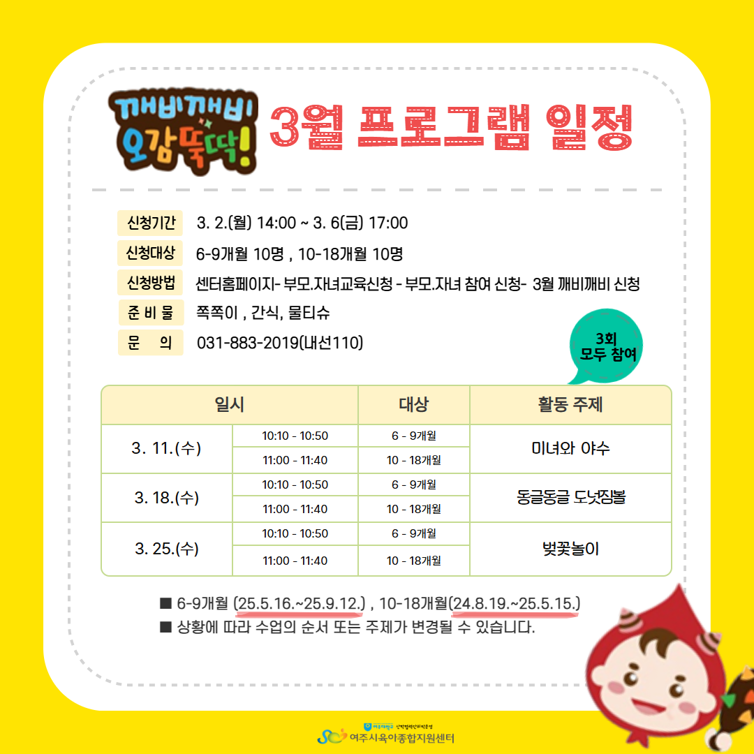 | ±âŸ»çÇ× | - ÁÖÂ÷ÀåÀÌ Çù¼ÒÇÏ¿À´Ï 5ºÐÀü±îÁö µµÂøÇÏ¿© Ȱµ¿ ½Ã°£¿¡ ´ÊÁö ¾Êµµ·Ï ÁÖÀǹٶø´Ï´Ù. - º» ÇÁ·Î±×·¥Àº ½ÅûÇÑ ¾ÆÀÌ1¸í°ú º¸È£ÀÚ 1Àθ¸ Âü¼®°¡´ÉÇÕ´Ï´Ù.(ÇüÁ¦,ÀڸŠÂü¿©ºÒ°¡) - ÇÁ·Î±×·¥ ´çÀÏ °á¼® ½Ã ÅëÇÕÆÐ³ÎÆ¼°¡ Àû¿ëµÇ´Ï À¯ÀÇÇØÁÖ¼¼¿ä (26³â 4¿ù ÇÑ´Þ °£ ¾ÆÀÌ»ç¶û ³îÀÌÅÍ& ¼¾ÅÍ ÇÁ·Î±×·¥ ½ÅûÁ¦ÇÑ) - °á¼® ½Ã Áõºù¼·ù¸¦ ²À ÁöÂüÇØ ÁÖ¼Å¾ß Çϸç Ãë¼Ò³ª °á¼®½Ã ´ã´çÀÚ¿¡°Ô ¿¬¶ôÁֽñ⠹ٶø´Ï´Ù. - ´ë±âÀÚ´Â ½Åû ¼øÀ¸·Î ¿¬¶ôµå¸®¸ç ºÎÀçÁß ½Ã ´ÙÀ½ ´ë±âÀÚ¿¡°Ô ¿¬¶ôµå¸³´Ï´Ù. - ´Ùȸ±â ÇÁ·Î±×·¥À¸·Î ÀÏÁ¤ È®ÀÎ ÈÄ Âü¿©°¡ ¸ðµÎ °¡´ÉÇϽаæ¿ì¿¡¸¸ ½ÅÃ»ÇØÁֽñ⠹ٶø´Ï´Ù. |
