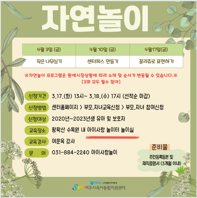 | (20~23³â»ý) ¾ÆÀÌ»ç¶û³îÀÌÅÍ ÀÚ¿¬³îÀÌ 2026³â 4. 3/ 10/ 17(±Ý) | |||