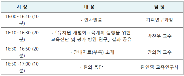 ¡¸À¯Ä¡¿ø °³º°È±³À°°èȹ ½ÇÇàÀ» À§ÇÑ ±³À°Áø´Ü ¹× Æò°¡ ¹æ¾È ¿¬±¸¡¹ ¼³¸íȸ °³ÃÖ ¾È³»