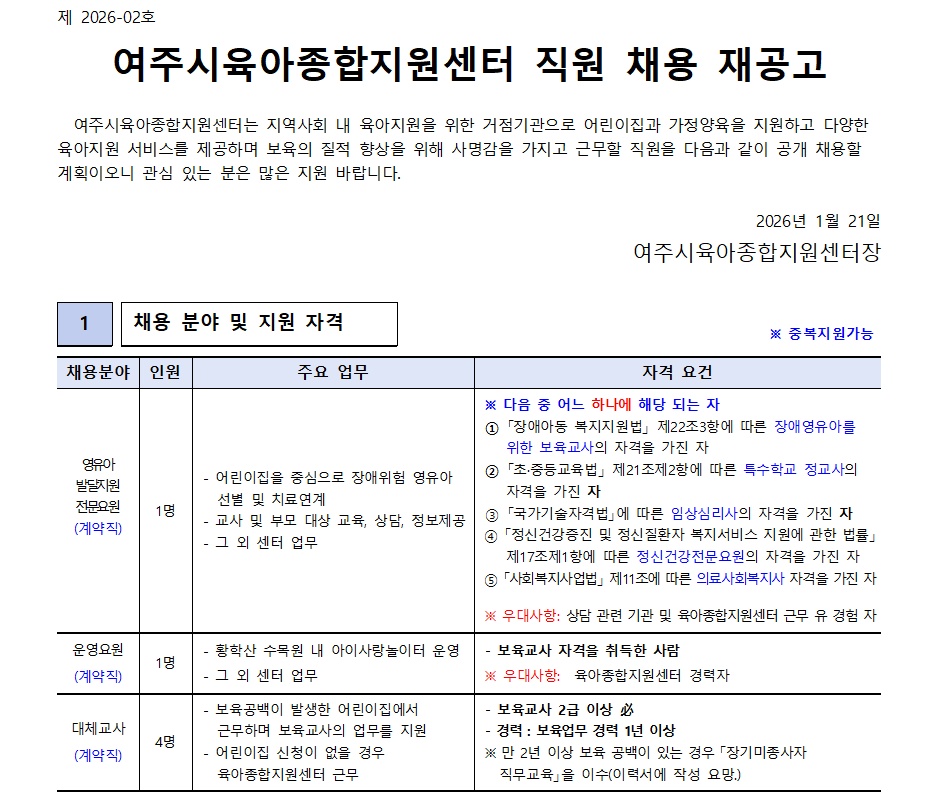 Á¦2026-02È£ ¿©ÁÖ½ÃÀ°¾ÆÁ¾ÇÕÁö¿ø¼¾ÅÍ Á÷¿ø[¿µÀ¯¾Æ¹ß´ÞÁö¿øÀü¹®¿ä¿ø, ¿î¿µ¿ä¿ø, ´ëü±³»ç] ä¿ë Àç°ø°í