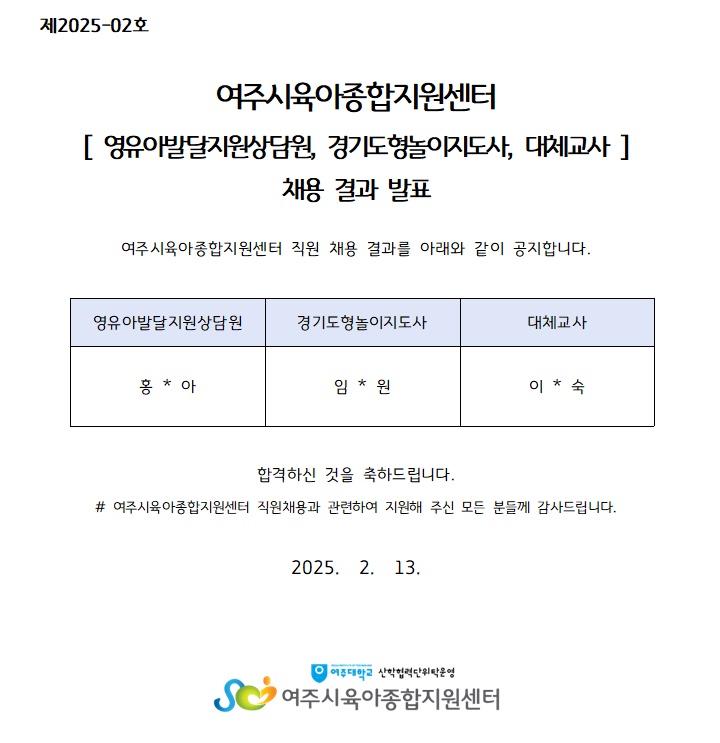 Á¦2025-02È£ ¿©ÁÖ½ÃÀ°¾ÆÁ¾ÇÕÁö¿ø¼¾ÅÍ Á÷¿ø ä¿ë ÃÖÁ¾ ÇÕ°ÝÀÚ ¹ßÇ¥ ¾È³»