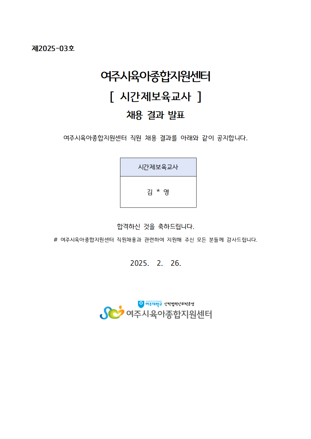 Á¦2025-03È£ ¿©ÁÖ½ÃÀ°¾ÆÁ¾ÇÕÁö¿ø¼¾ÅÍ Á÷¿ø ä¿ë ÃÖÁ¾ ÇÕ°ÝÀÚ ¹ßÇ¥ ¾È³»