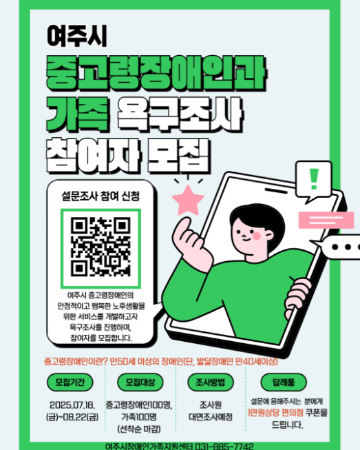 2025³â¡¸Áß°í·ÉÀå¾ÖÀΰú °¡Á· ¿å±¸Á¶»ç¡¹ Âü¿©ÀÚ ¸ðÁý È«º¸ ¾È³» (¿©ÁÖ½ÃÀå¾ÖÀΰ¡Á·Áö¿ø¼¾ÅÍ)