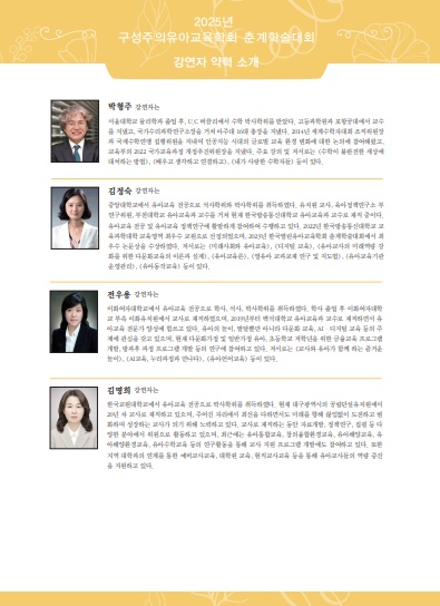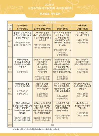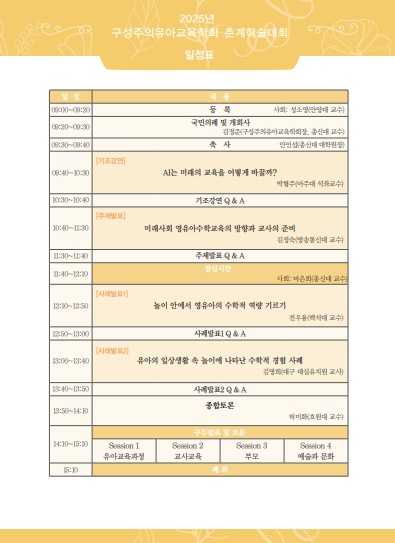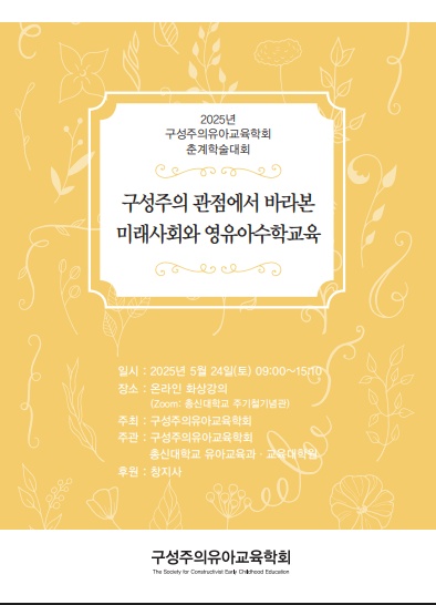<2025³â ±¸¼ºÁÖÀÇÀ¯¾Æ±³À°ÇÐȸ Ãá°èÇмú´ëȸ »çÀüµî·Ï ½Åû ¾È³»> (1) ÀÏ ½Ã : 2025³â 5¿ù 24ÀÏ(Åä) 9:00 ~ 15:10 (2) Àå ¼Ò : ¿Â¶óÀÎ È»ó °ÀÇ(Zoom) (3) ÁÖ Á¦ : ±¸¼ºÁÖÀÇ °üÁ¡¿¡¼ ¹Ù¶óº» ¹Ì·¡»çȸ¿Í ¿µÀ¯¾Æ¼öÇб³À° (4) ÀÏ Á¤