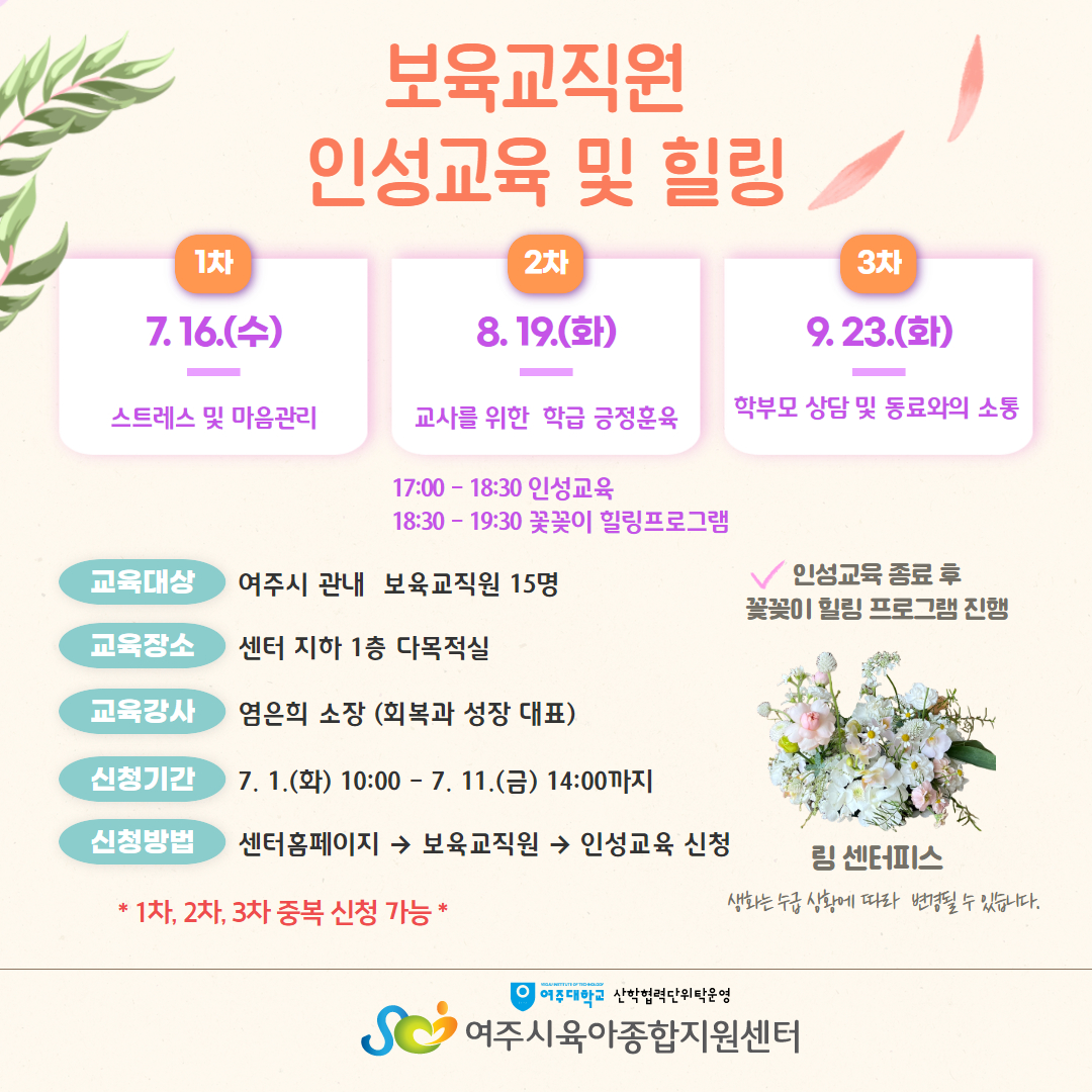 | ±âŸ»çÇ× | 1. ´ë¸é±³À°ÀÔ´Ï´Ù. 2. Àμº±³À° Á¾·á ÈÄ ¸µ¼¾ÅÍÇǽº ²É²ÈÀÌ Èú¸µ ÇÁ·Î±×·¥ÀÌ ÁøÇàµË´Ï´Ù. 3. Àμº±³À° 17:00-18:30 Á¾·á ÈÄ ¸µ¼¾ÅÍÇǽº ²É²ÈÀÌ Èú¸µÇÁ·Î±×·¥ ÁøÇà 18:30-19:30 |