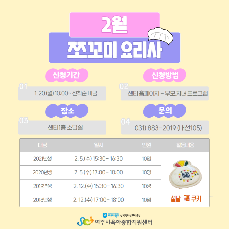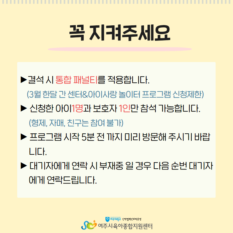 | ±âŸ»çÇ× | - ÁÖÂ÷ÀåÀÌ Çù¼ÒÇÏ¿À´Ï 5ºÐÀü±îÁö µµÂøÇÏ¿© Ȱµ¿ ½Ã°£¿¡ ´ÊÁö ¾Êµµ·Ï ÁÖÀǹٶø´Ï´Ù. - º» ÇÁ·Î±×·¥Àº ½ÅûÇÑ ¾ÆÀÌ1¸í°ú º¸È£ÀÚ 1Àθ¸ Âü¼®°¡´ÉÇÕ´Ï´Ù.(ÇüÁ¦,ÀڸŠÂü¿©ºÒ°¡) - ÇÁ·Î±×·¥ ´çÀÏ °á¼® ½Ã ÅëÇÕÆÐ³ÎÆ¼°¡ Àû¿ëµÇ´Ï À¯ÀÇÇØÁÖ¼¼¿ä (25³â 3¿ù ÇÑ´Þ °£ ¾ÆÀÌ»ç¶û ³îÀÌÅÍ& ¼¾ÅÍ ÇÁ·Î±×·¥ ½ÅûÁ¦ÇÑ) - °á¼® ½Ã Áõºù¼·ù¸¦ ²À ÁöÂüÇØ ÁÖ¼Å¾ß Çϸç Ãë¼Ò³ª °á¼®½Ã ´ã´çÀÚ¿¡°Ô ¿¬¶ôÁֽñ⠹ٶø´Ï´Ù. - ´ë±âÀÚ´Â ½Åû ¼øÀ¸·Î ¿¬¶ôµå¸®¸ç ºÎÀçÁß ½Ã ´ÙÀ½ ´ë±âÀÚ¿¡°Ô ¿¬¶ôµå¸³´Ï´Ù. |